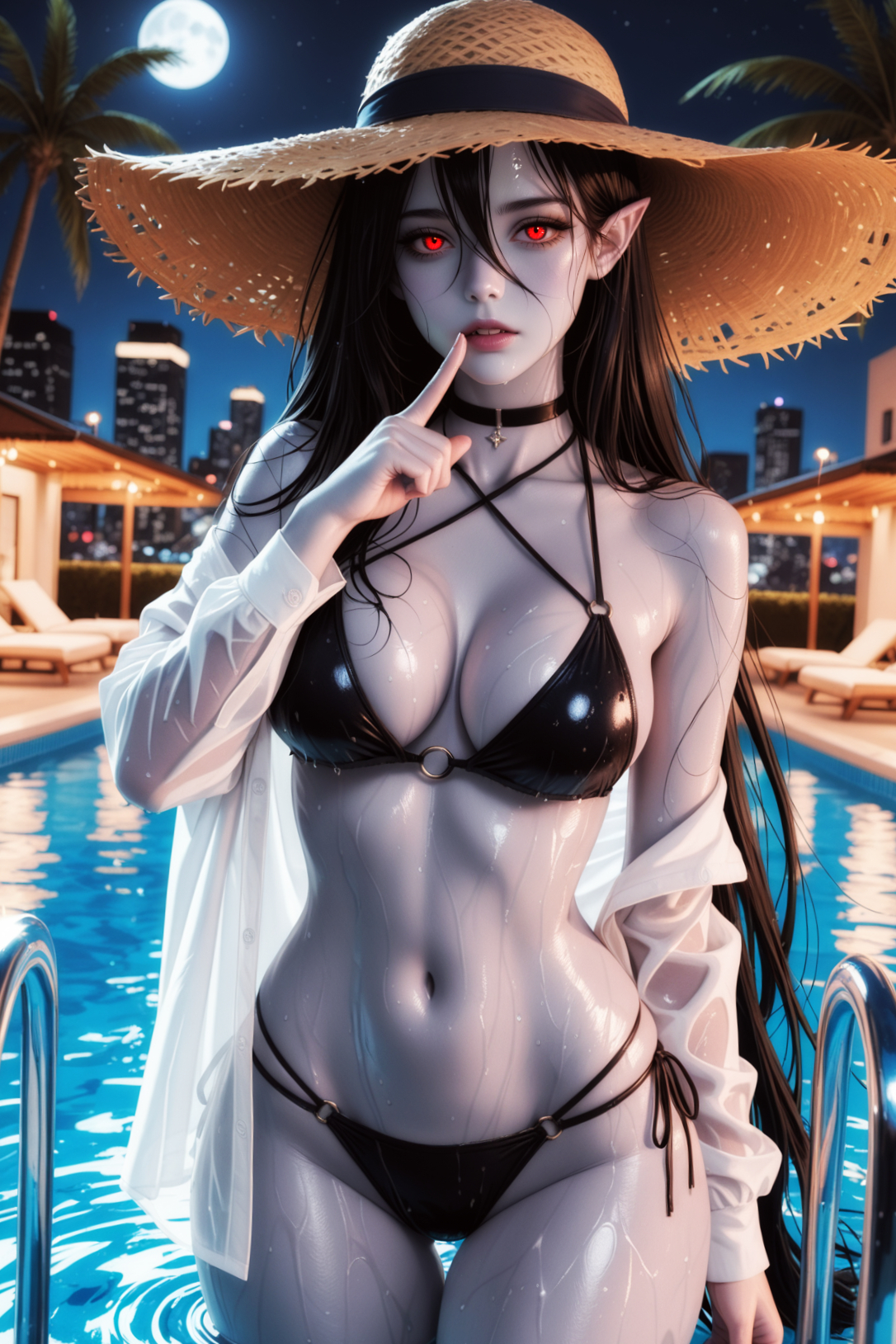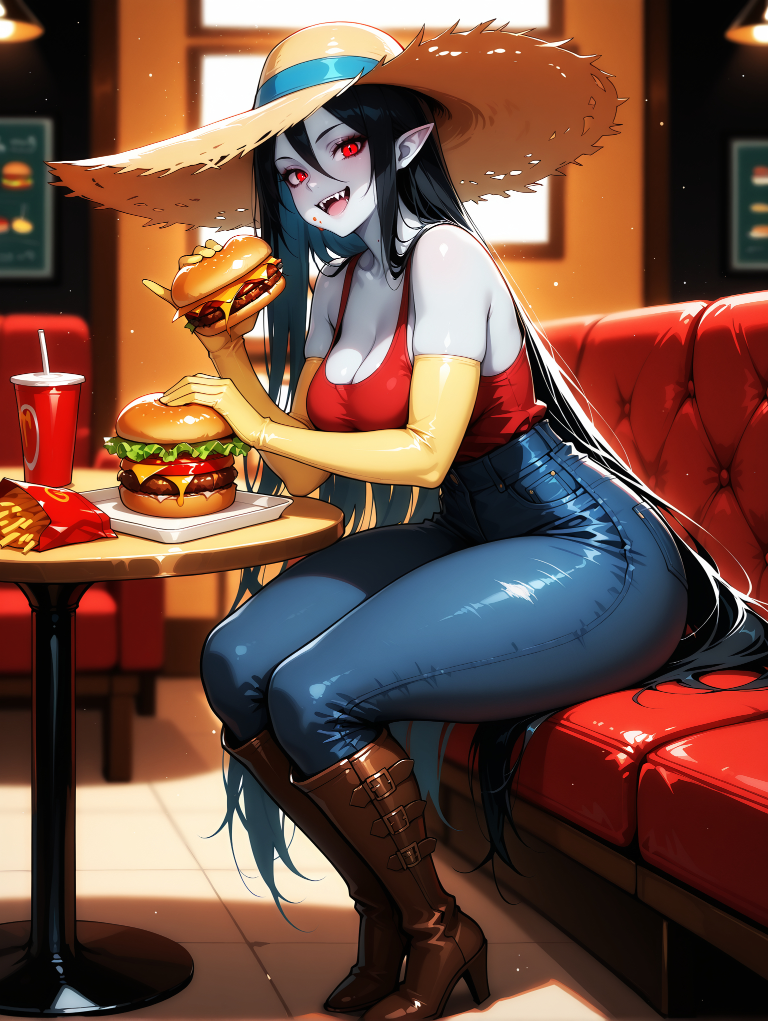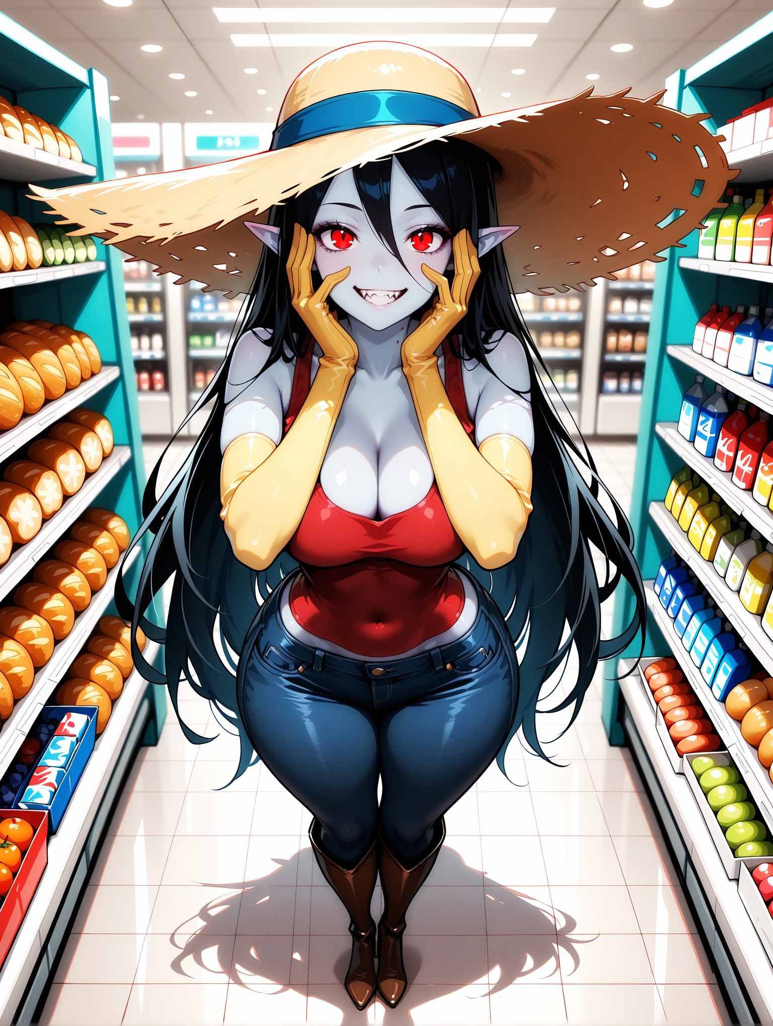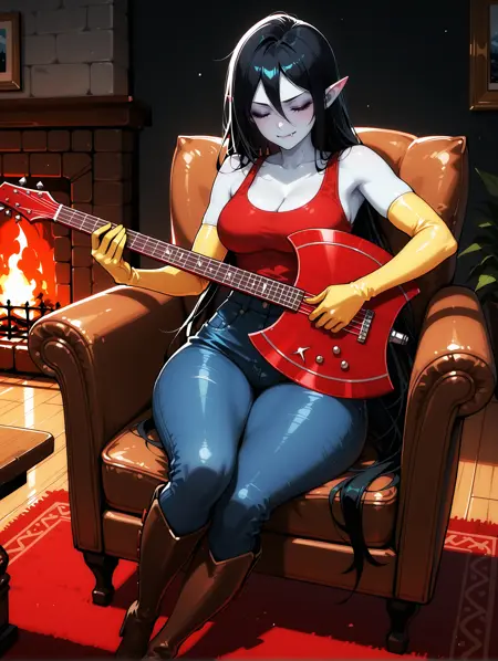Marceline Prompts : 1girl, long hair, black hair, colored skin, red eyes, very long hair, grey skin, vampire, pointy ears, bite mark, fangs