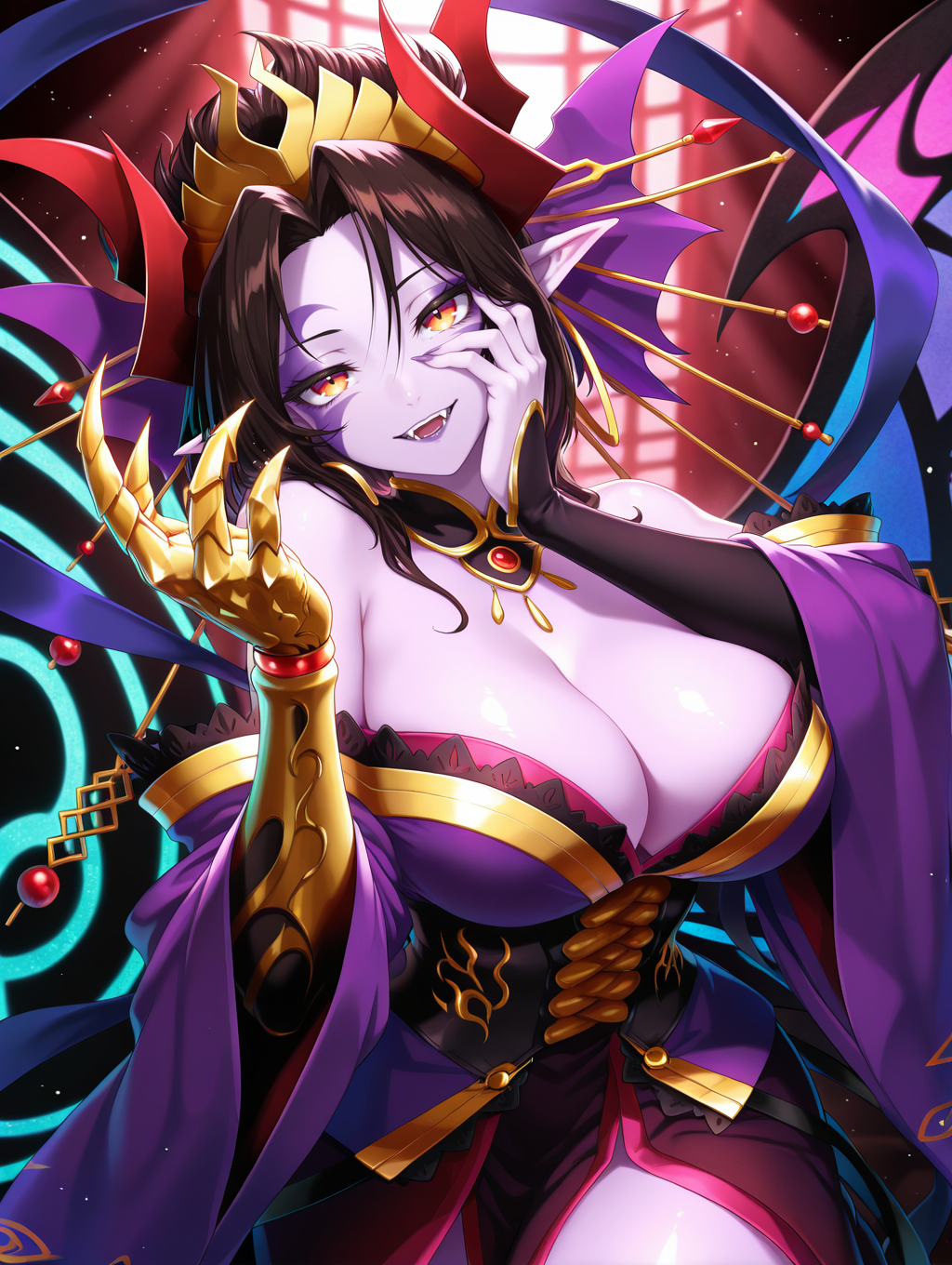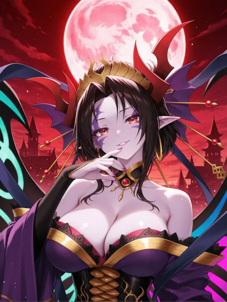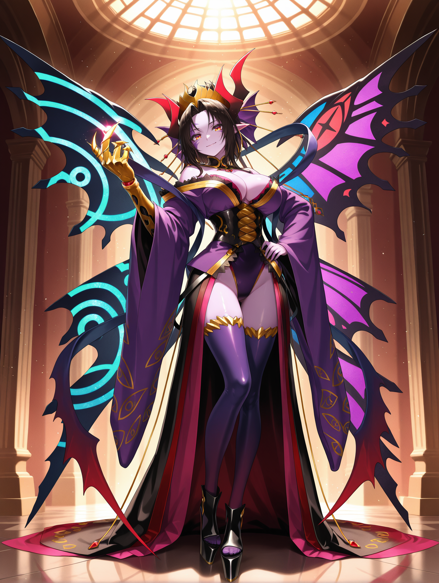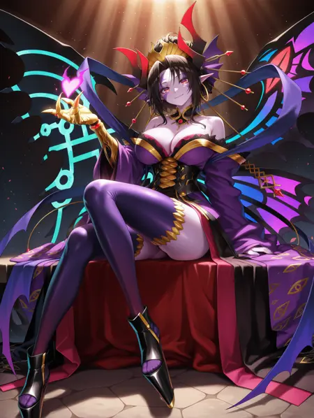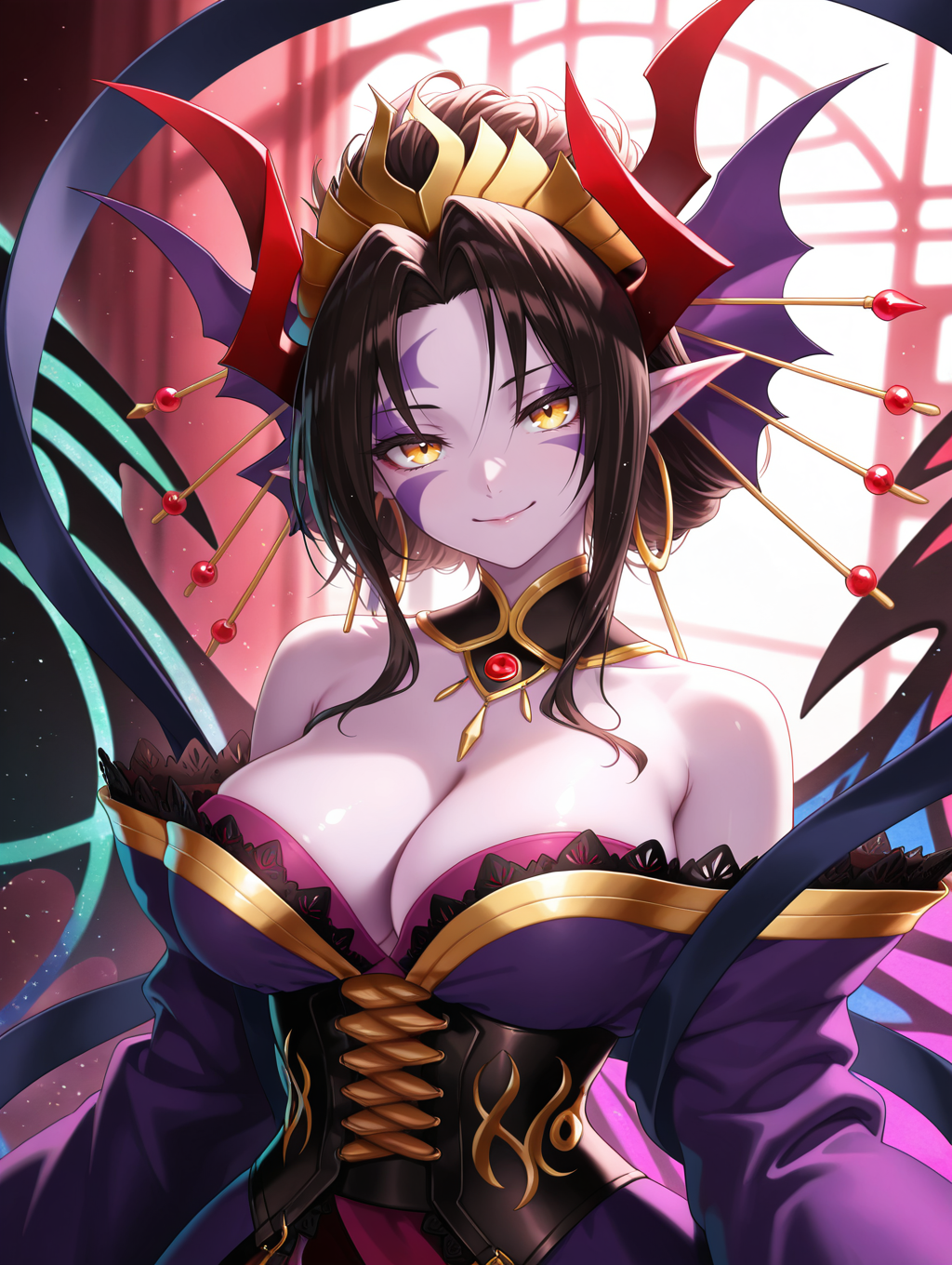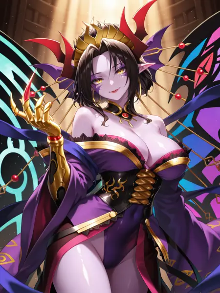 标签(角色额外):恶魔女孩,紫色皮肤,面部纹身,展开的翅膀