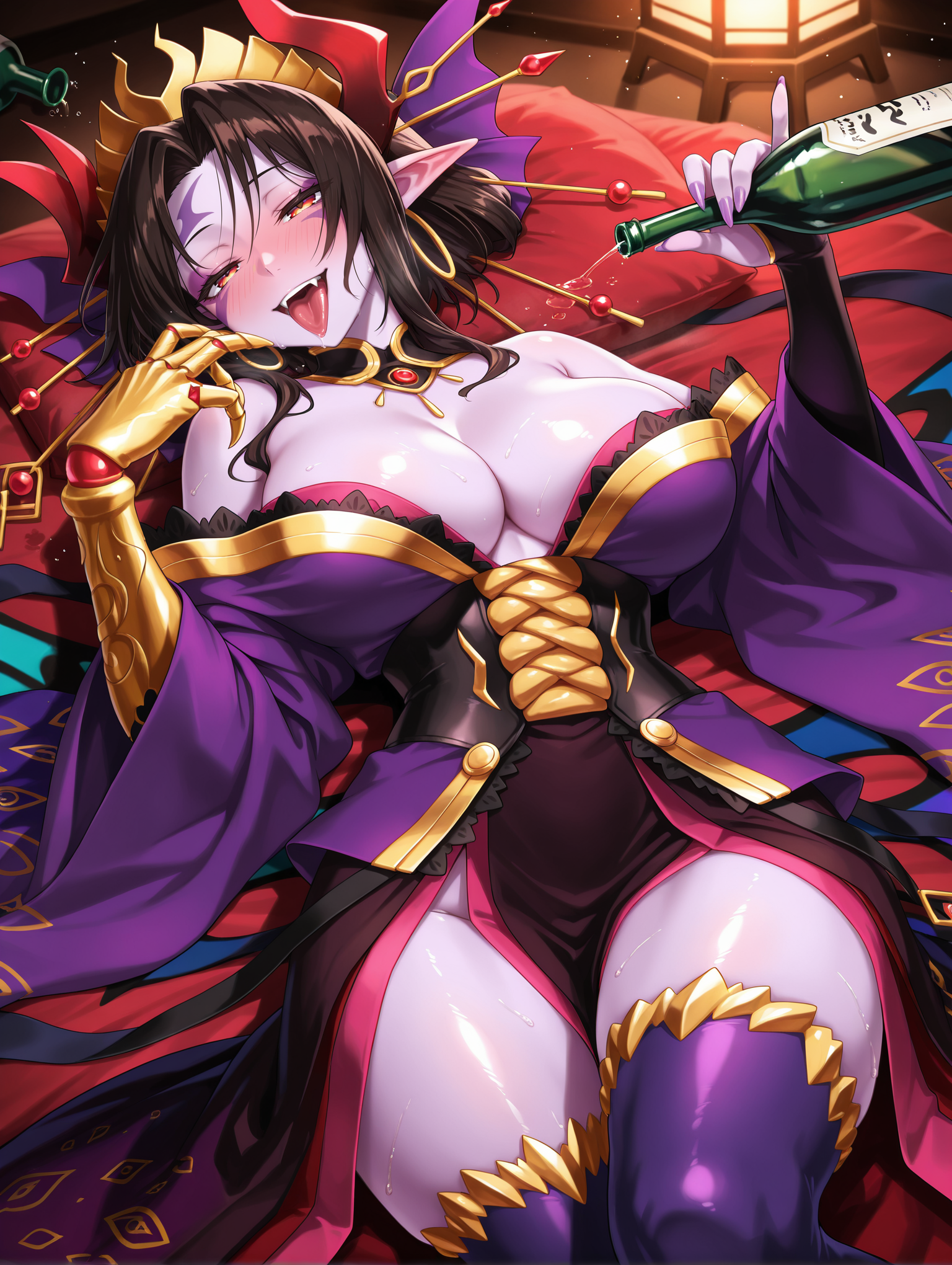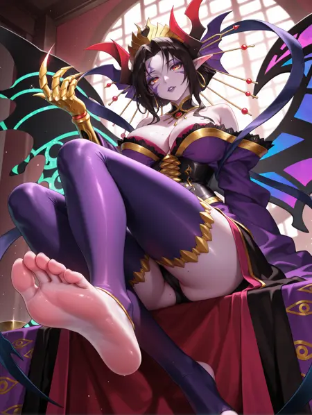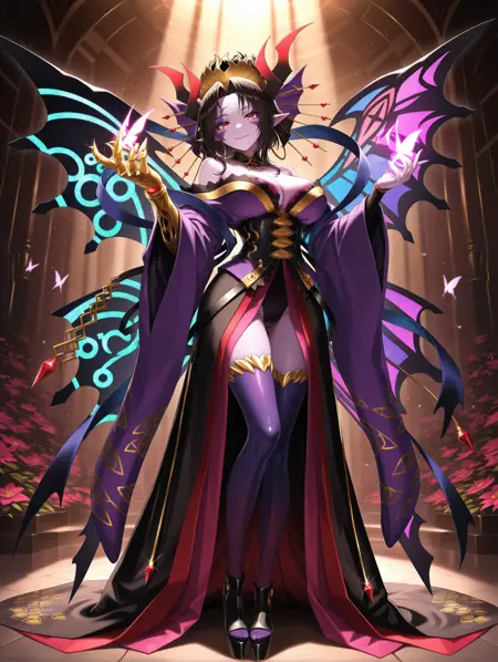 标签(服装):金色耳环,金色王冠,发饰,金色镶边,黑色领圈,紫色羽衣,紫色和服,紫色宽袖,单爪手套,单 bridal 手套,黑色紧身胸衣,紫色过膝袜,黑色厚底高跟鞋