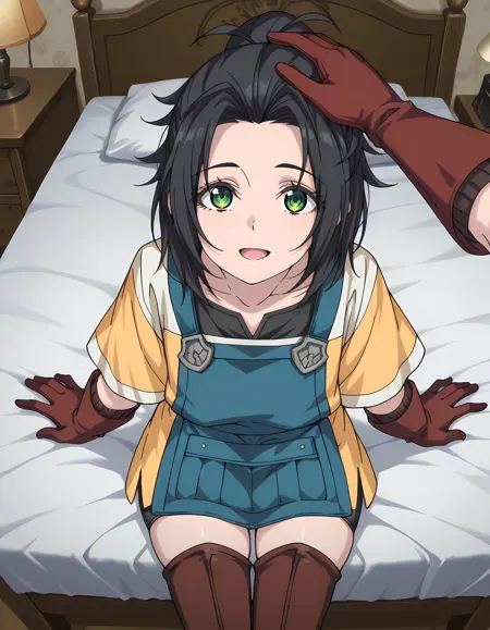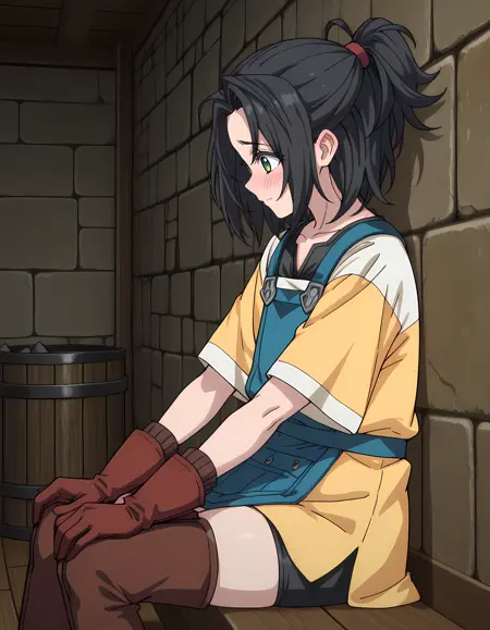 blue apron, pocket, oversized shirt, yellow shirt, short sleeves, black undershirt, brown gloves, brown thigh boots, zettai ryouiki, black bike shorts,