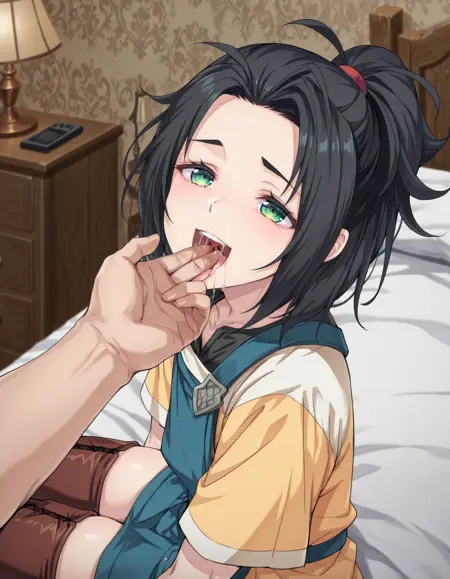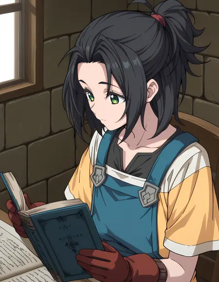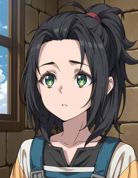 G0u, 1boy, otoko no ko, black hair, medium hair, hair tie, short ponytail, high ponytail, curtained bangs, antenna hair, sidelocks, green eyes, collarbone,