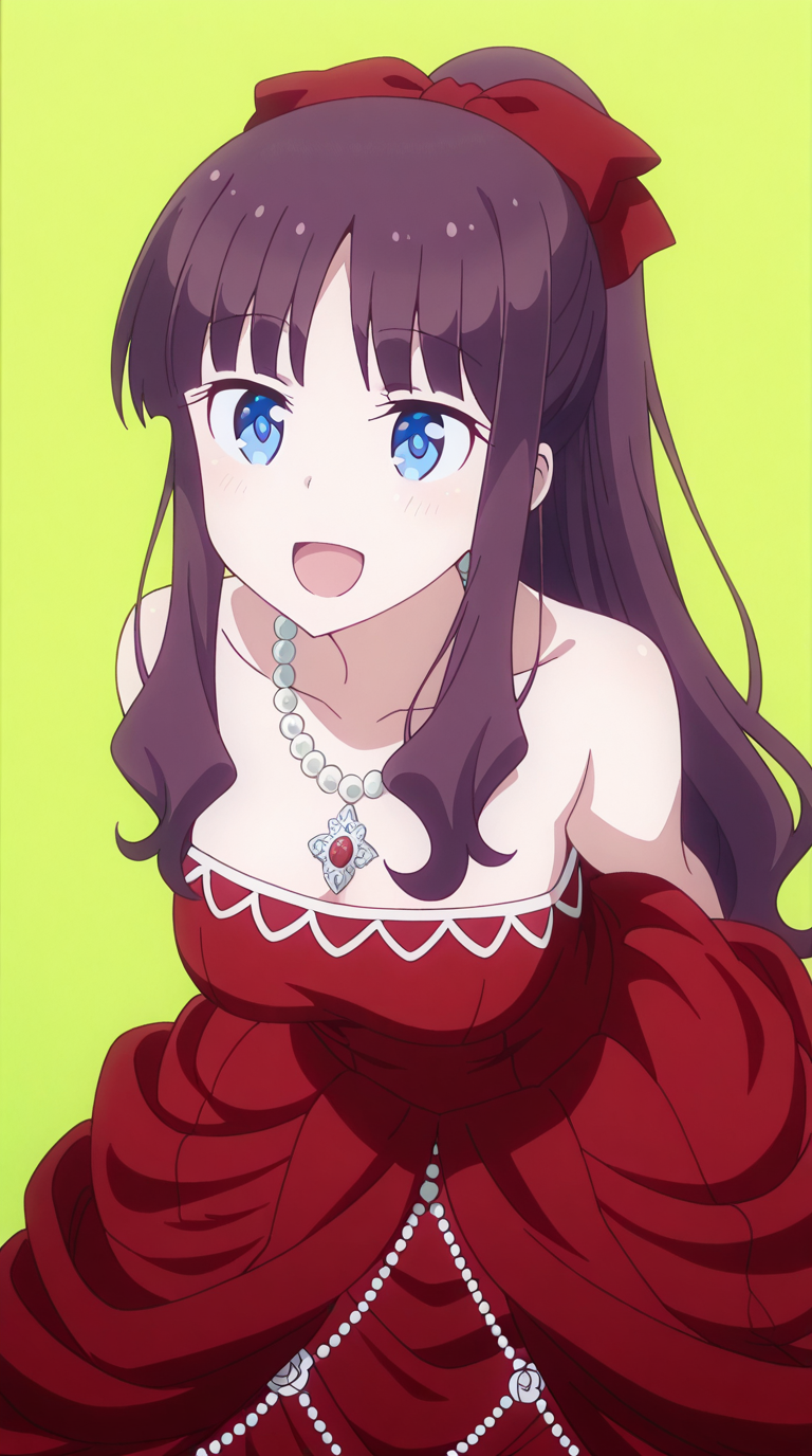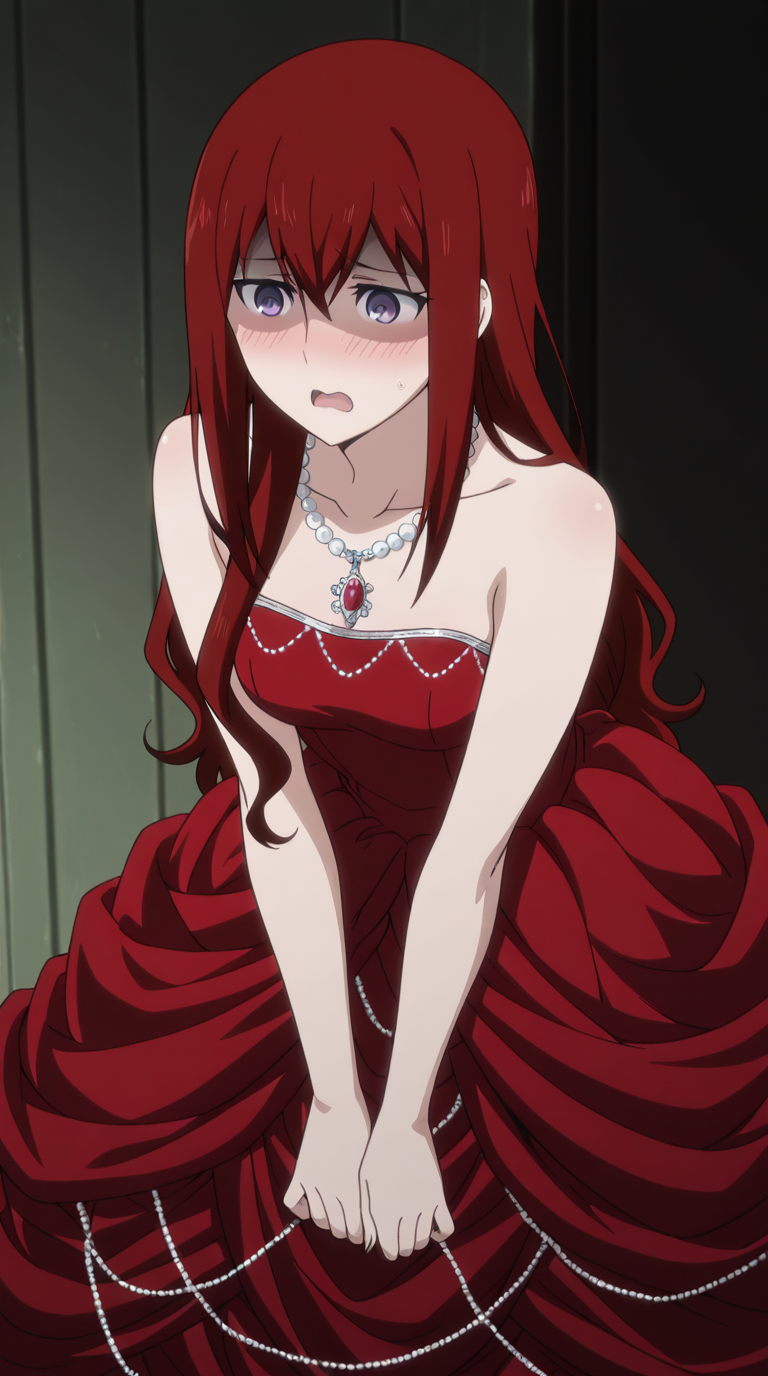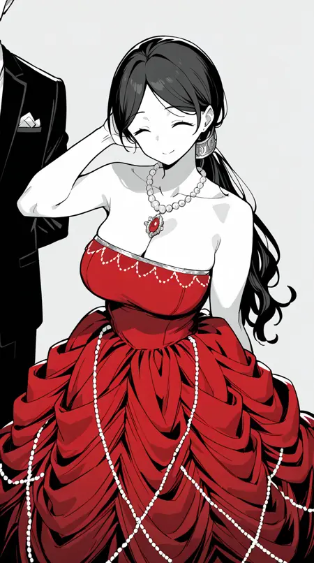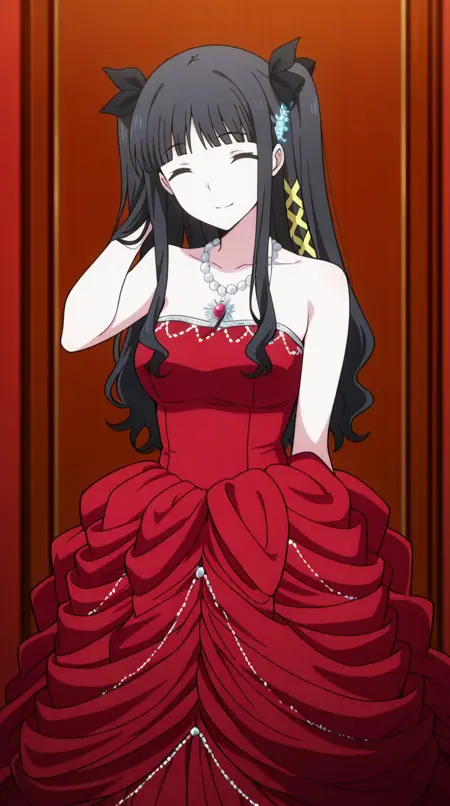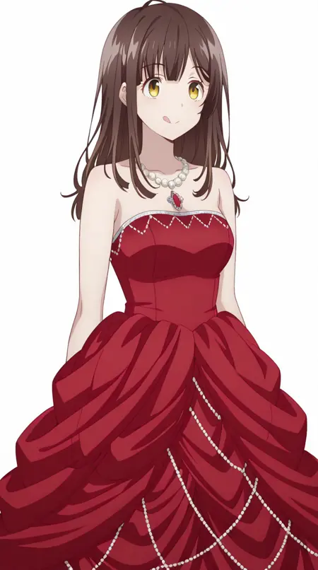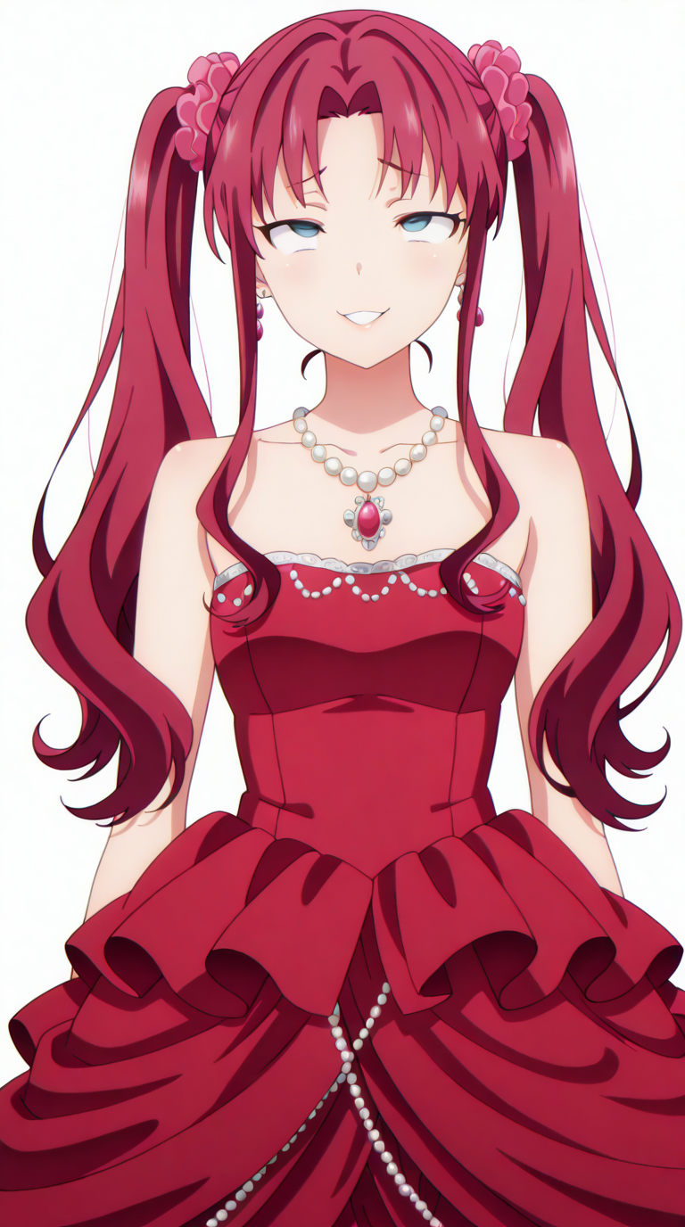 lora:rintohsaka10thanniversary-illustriousxl-lora-nochekaiser:1, rintohsaka10thanniversary, 单人, 连衣裙, 珠宝, 露肩, 项链, 无吊带, 红色连衣裙, 无吊带裙, 珍珠项链, 红色礼服, 正式, 珍珠装饰, 珍珠裙, 层叠裙