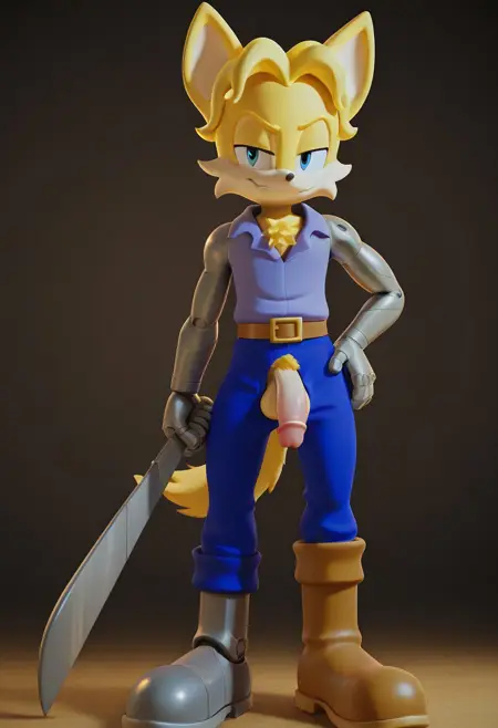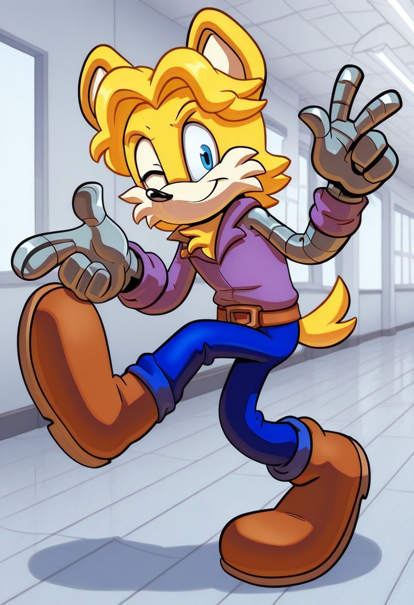 Jacques D'Coolette, furry, beige fur, blue eyes, yellow hair, periwinkle blue collared shirt, yellow tail, brown belt, blue pants, cyborg leg, cyborg arm, brown boots
