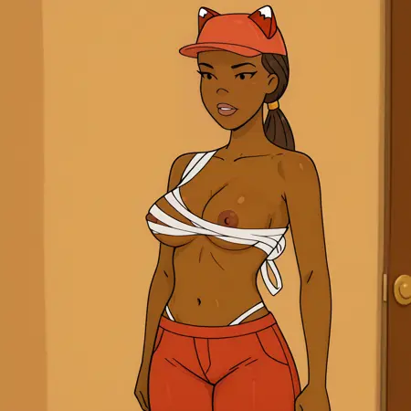- トリガー: FoxxyDrawnTogether, 1girl, 暗い肌の女性, 中程度の胸, 暗い肌, 狐の尾, 動物の耳, クロップトップ, ショートパンツ, 指なし手袋, 胸元の露出, ハット, ポニーテール, へそ, 腹部, パンツ, 下着, タンクトップ, 茶色の髪, 長い髪
