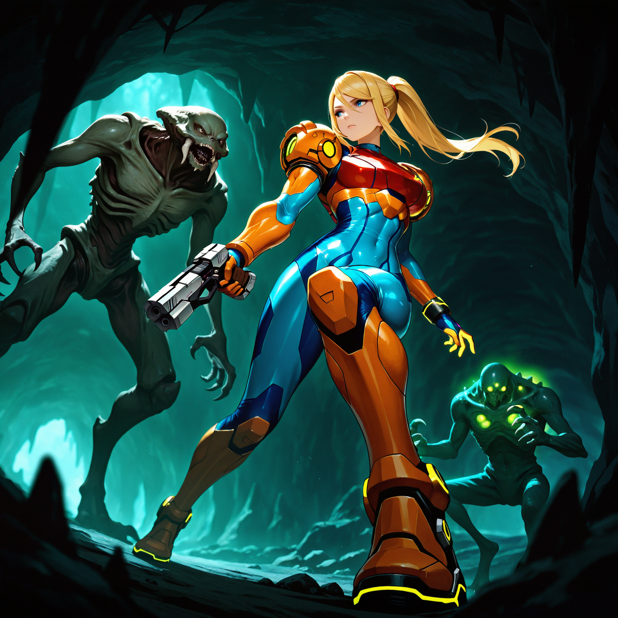 The Bounty Hunter's foundation is a two-step process, with the first step establishing the structure of the piece. The AI is tuned to spend extra time specifically focusing on the foundation of the image, while generating at the smallest possible resolution. The foundation includes things like the subjects and their poses, the objects in the image, the lighting, and anything that's part of the composition and overall layout. Step one is kind of like the line artist for an illustration, preparing a piece to be finished by other artists, or the 3D sculptor of a mini-figure. Before passing off the piece to the next step, the image is "upscaled" (made larger) by being passed though latent refinement (checking pixel by pixel), mimicking "hi-res upscaling" (a common image generation tool).