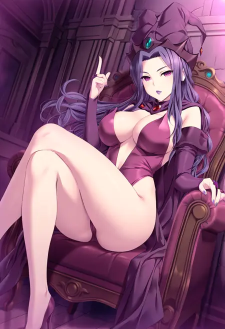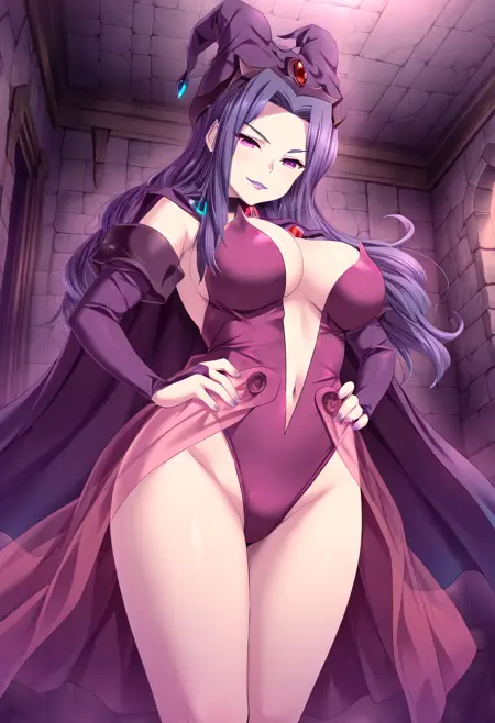 衣装(メイン): veronicamaincostume, wizard hat, cape, leotard, bridal gauntlets, detached sleeves, center opening, see through, purple high heels