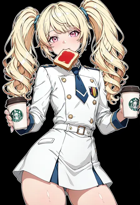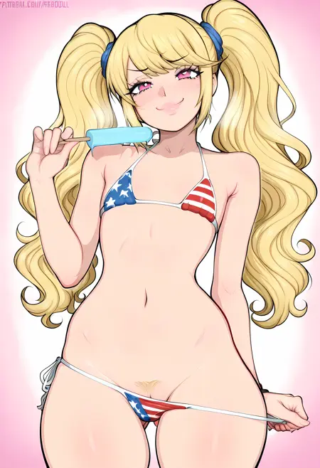 1 female, white girl, pink eyes, skin, cute blonde, twintails, blue hairtie, long wavy hair, short, puffy thighs, short