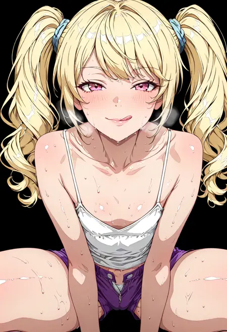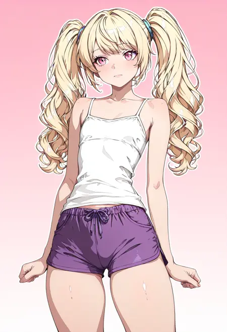 female, white girl, pink eyes, skin, cute blonde, twintails, blue hairtie, long wavy hair, short, puffy thighs, short, skindention, white camisole, purple bootyshorts,