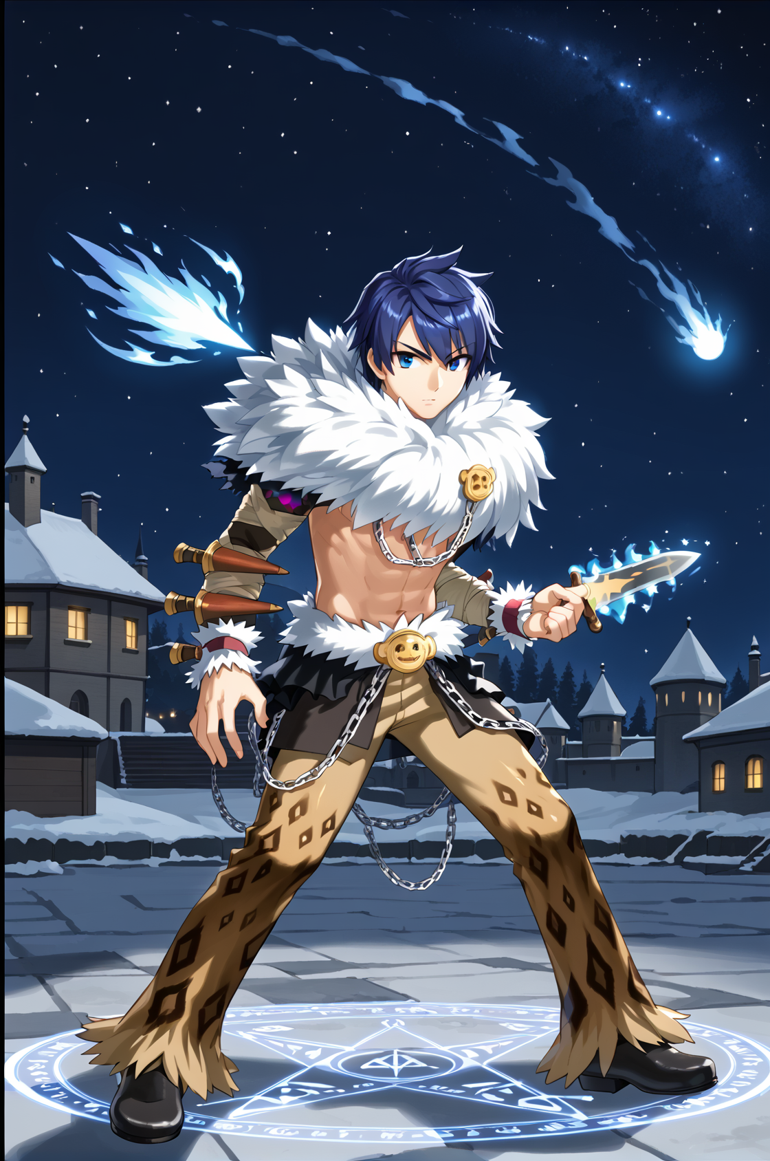 prompt: shadowCROMale, chain, fur trim, fur collar, topless, detached sleeves, daggers, wrist cuffs, navel, midriff, leopard print pants, belt, waist cape, shoes