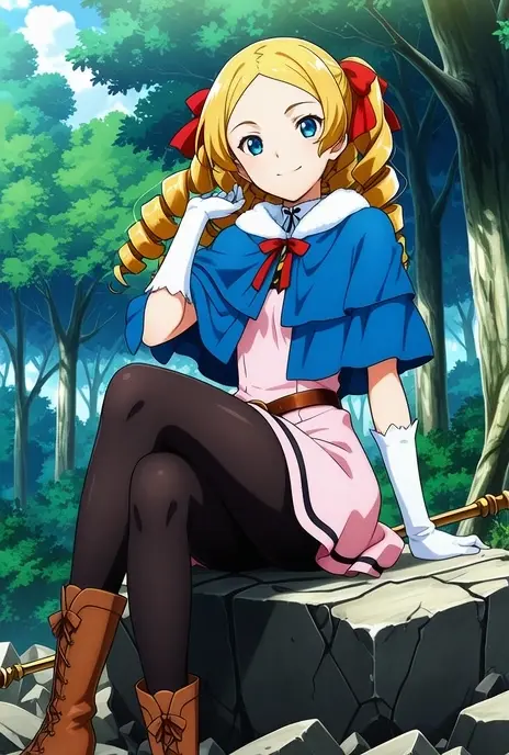 JelaMage, 1girl, solo, twintails, drill hair, hair ribbon, blue eyes, blonde hair, gloves, long hair, staff, dress, capelet, ribbon, smile, black pantyhose, boots,