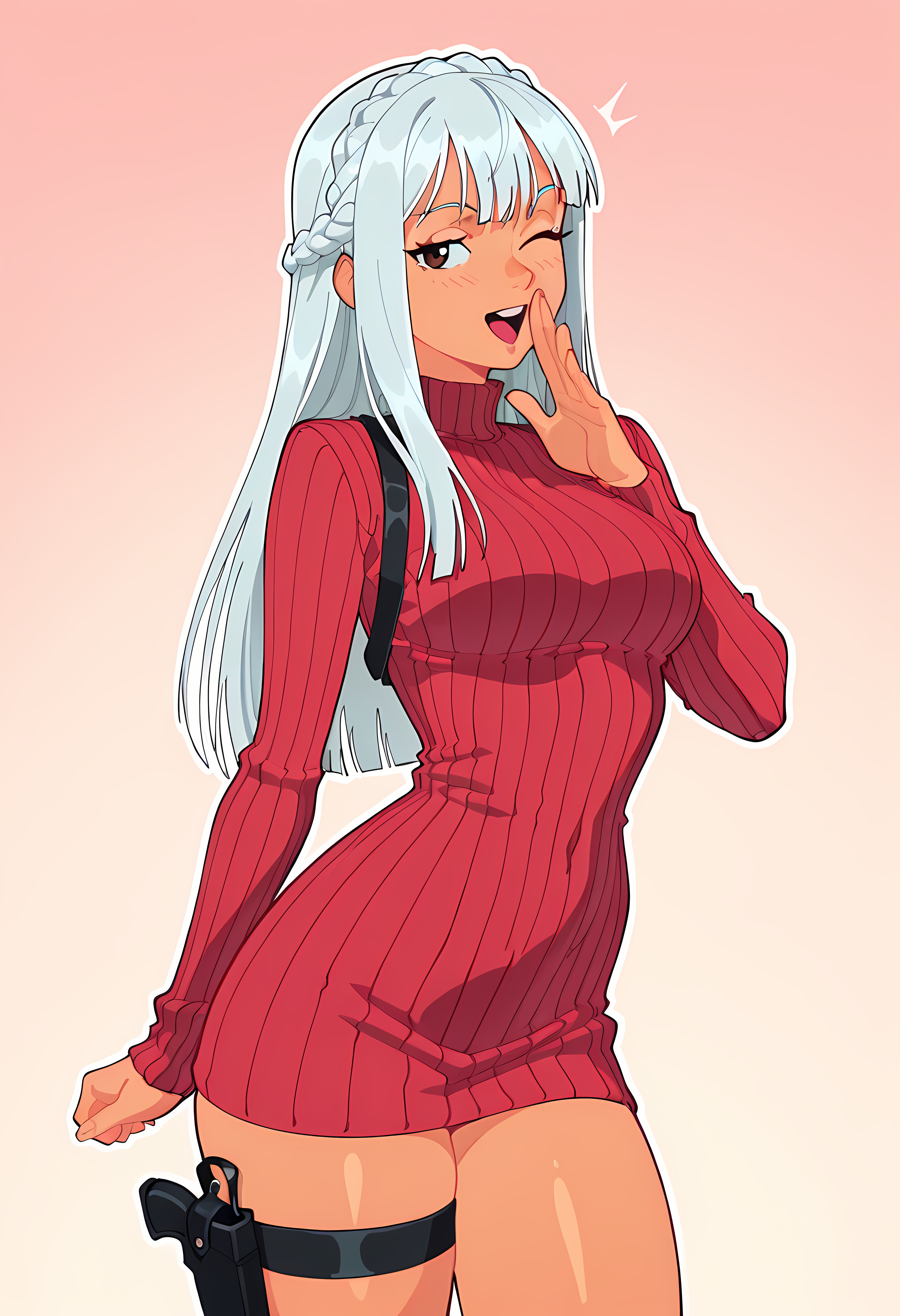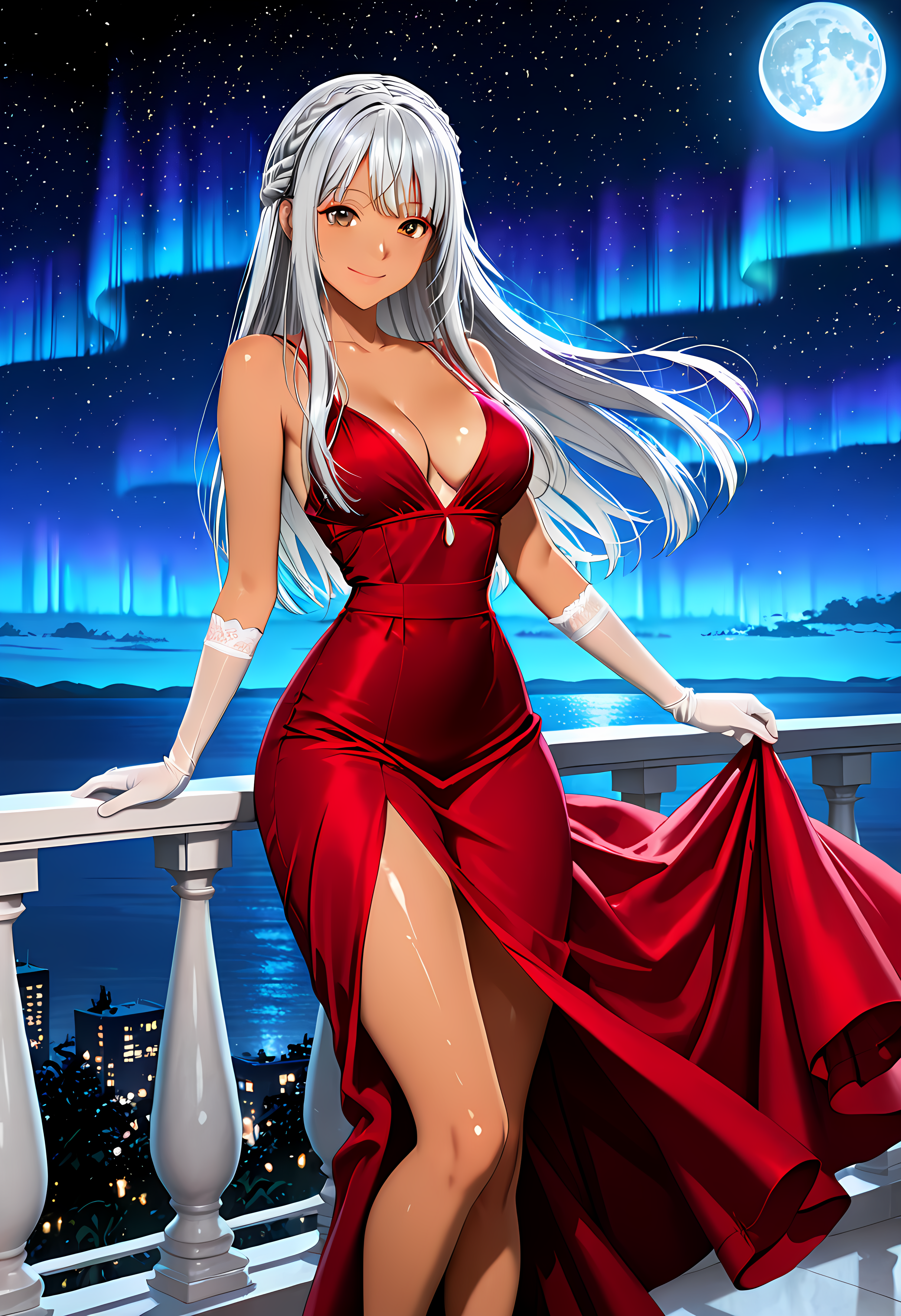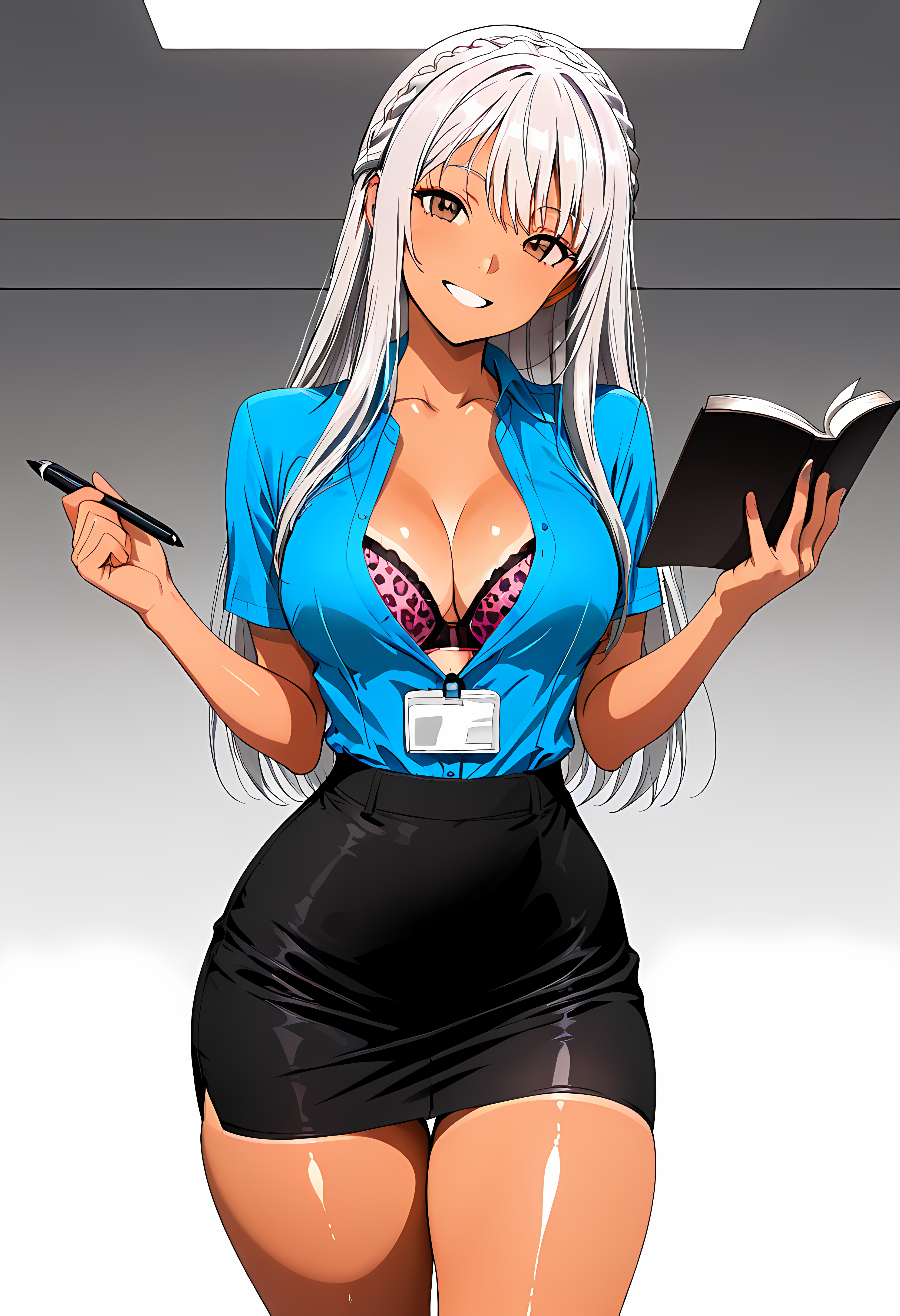 1 female, tan skin, long hair, silver hair, crown braid, straight hair, brown eyes, medium breasts, slim waist, curvy, thick thighs,