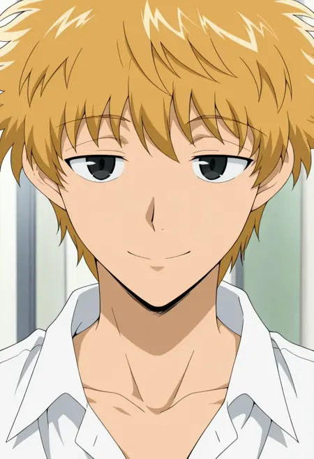 1boy, male focus, solo, black eyes, blonde hair, school uniform, white shirt, collared shirt, collarbone, short sleeves, black pants,