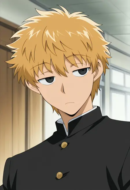 1boy, male focus, solo, black eyes, blonde hair, school uniform, gakuran, black jacket, partially unbuttoned, white shirt, collared shirt, red undershirt, black pants,