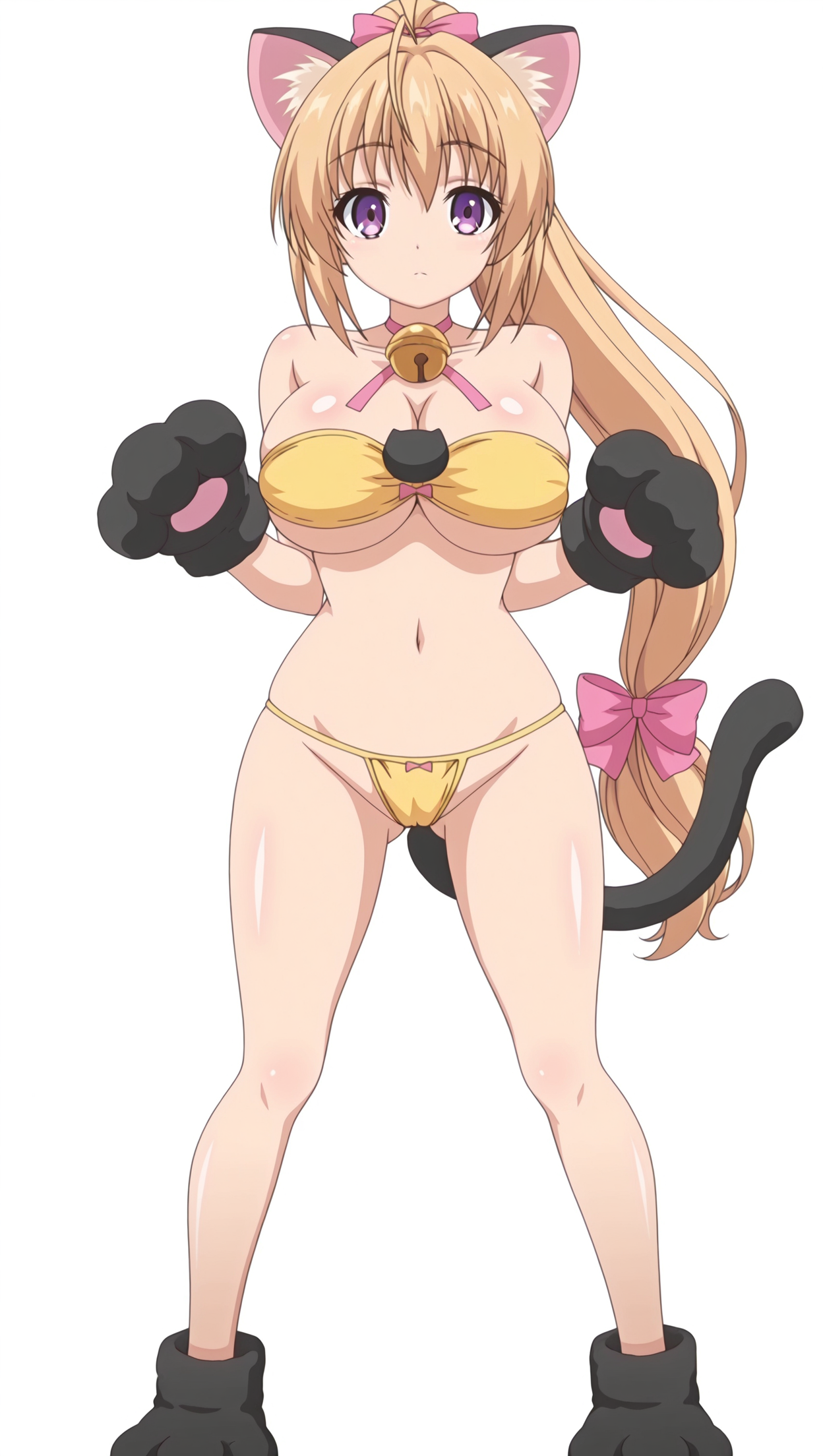 anime coloring, masterpiece, best quality, amazing quality, h4n4, 1girl, long hair, ponytail, blonde hair, purple eyes, large breasts, hair bow, mouse ears, neck bell, micro bikini, yellow bikini, paw gloves, tail plug, anal tail, paw shoes, solo, pose, standing, looking at viewer, from front, ((((white background, simple background))))