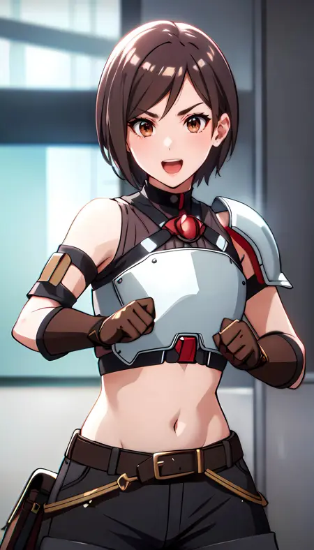 red breastplate, leather gloves, belt, shorts, short brown hair, brown eyes