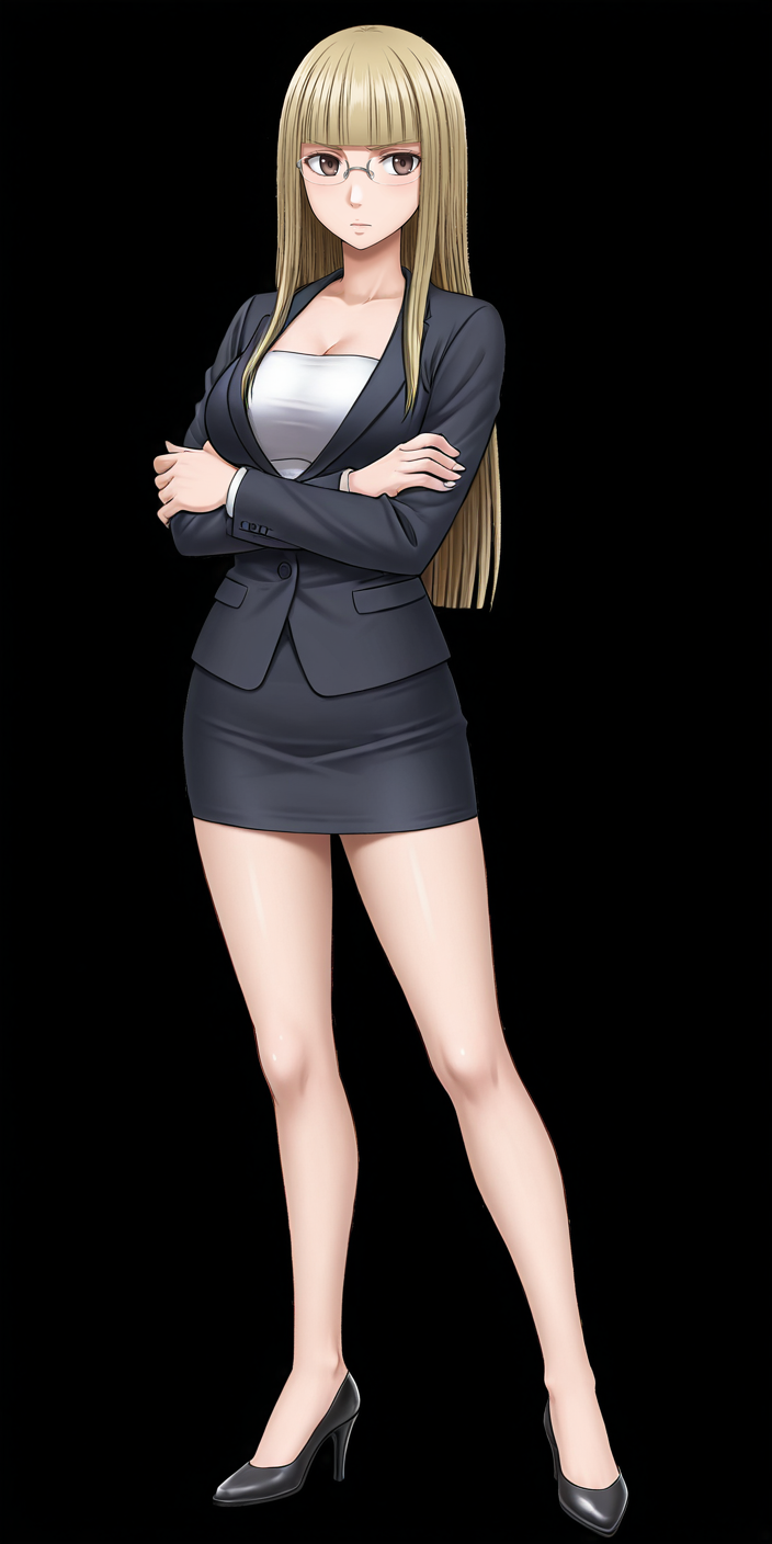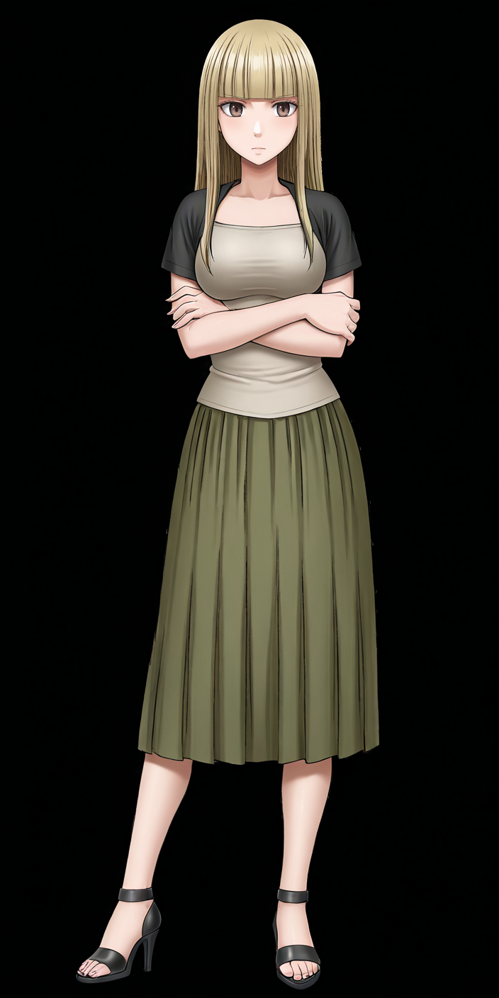 kagurazakaelena,long hair,blonde hair,brown eyes,large breasts, black short-sleeve shrug, beige tank top, long skirt, green skirt, brown belt, big buckle, necklace, pendant necklace, bracelet, hair accessory, hair wrap, ribbon,open-toe shoes, black high heels