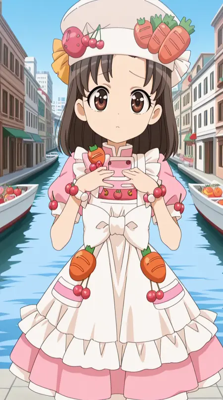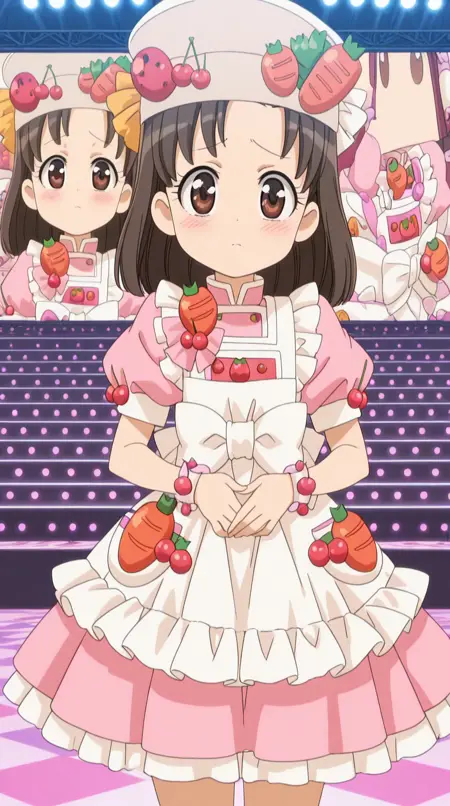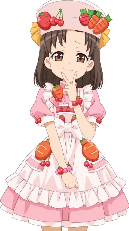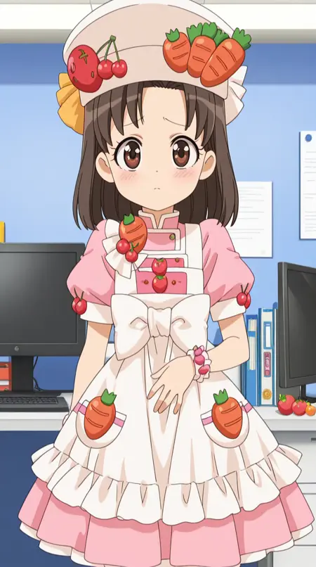 hat, food, fruit, strawberry, carrot, cherry, tomato, food-themed clothes, dress, hat, apron, bowtie, frills, juliet sleeves, white apron, pink shirt, skirt, pink skirt, short sleeves