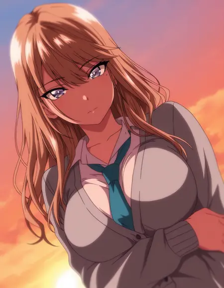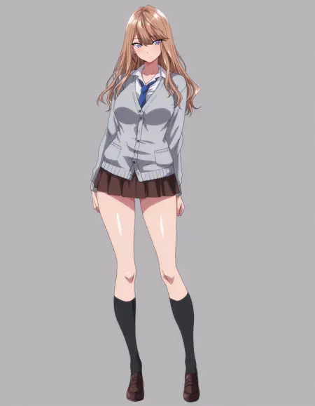 mai_hj,mai_g6hj,long_hair,brown_hair,purple_eyes,mole_under_eye,school_uniform,grey_cardigan,blue_necktie,brown_pleated skirt,black_kneehighs,loafers