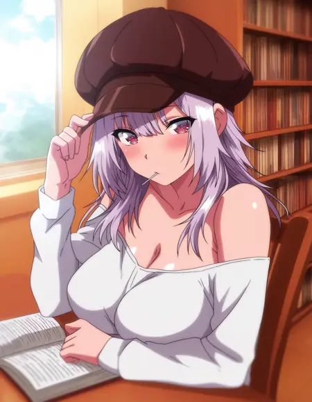 mai_hj,mai_g4hj,long_hair,pink_hair,red_eyes,x_hair_ornament,black_headwear,off-shoulder_sweater,purple_sweater,bra_strap,brown_shorts,black_thighhighs,black_footwear