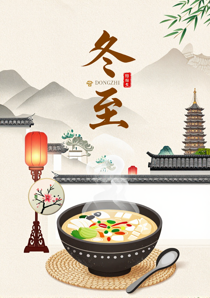 ZitCNDongzhi, 图像具有中国传统风格的背景,背景宁静而艺术。顶部有一个很大的书法文字,上面写着“冬至”,翻译过来就是“冬至”。在它的下面,还有一个文字,写着“DONGZHI”,表示该地点的名称。 “冬至阳生”字写得较小,翻译过来就是“冬至”。 前景中,一碗汤放在编织垫上。碗是黑色的,上面有白色圆点,里面装着各种配料,包括似乎是豆腐、蔬菜,可能还有一些肉。碗旁边的垫子上放着一把勺子。 碗的左边有一盏红白相间的中国传统灯笼。灯笼安装在一个支架上,旁边是一个带有花卉图案的圆扇。 背景描绘了中国传统建筑的风景,包括一座宝塔和一座瓦顶建筑。周围环绕着山脉和树木,色彩柔和。 画面整体构图和谐,融合了中国传统文化元素,以一碗汤为中心,营造出温馨、温馨的氛围。