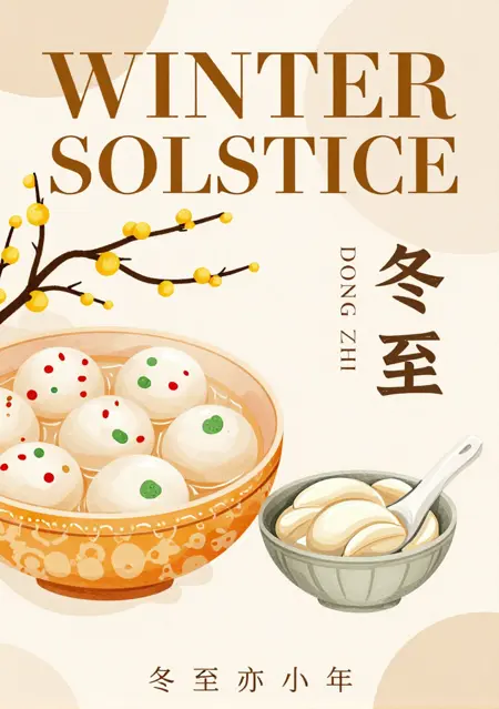 ZitCNDongzhi, 该图像具有米色背景的垂直横幅,具有微妙的装饰图案。上面放着一个薄釉蒸饺,放在竹蒸笼里。其下方,用白色粗体大字写着“WINTER SOLACE”,下方写着“冬至”两个汉字。底部还有一个碗,里面盛着小而圆的饺子,放在清汤里,撒上红色香料。 “冬至亦小年"的文字采用较小的黑色字体书写,整体设计简约,重点关注食物和文字。