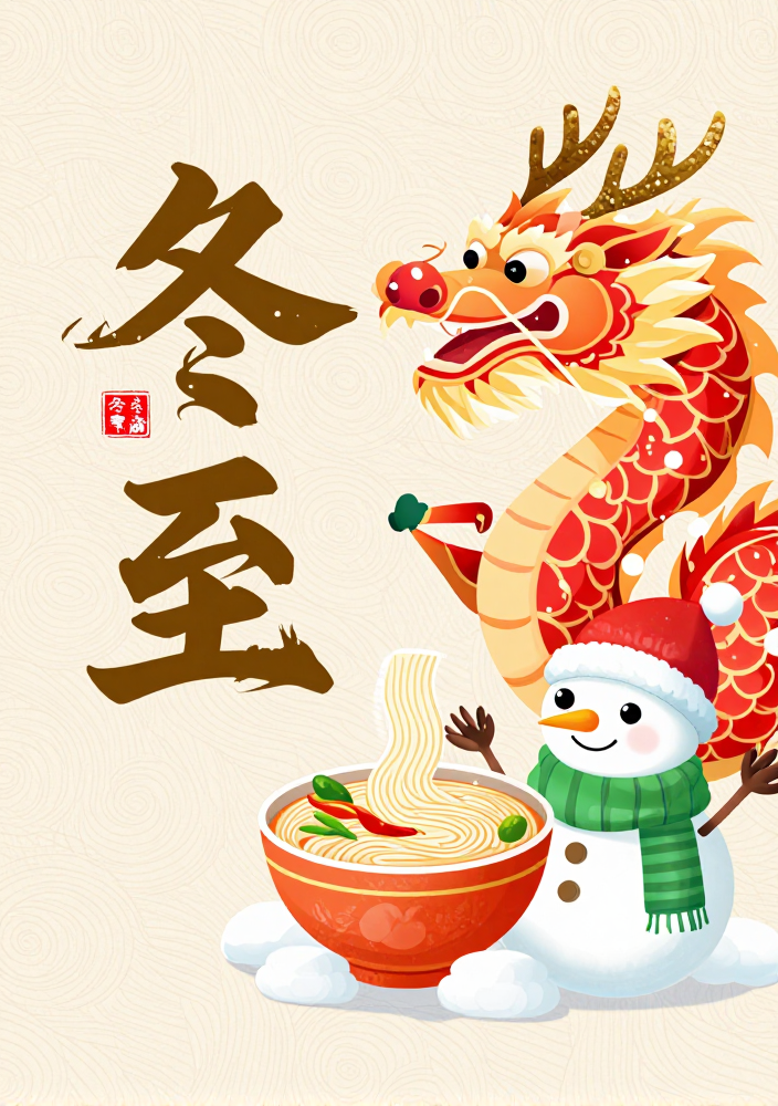 ZitCNDongzhi, 该图像采用节日和冬季主题的设计,重点关注雪地环境。中央有一个粗体的大字,看起来像是“冬至”。在角色的右侧,有一个充满活力的中国传统龙插图,龙以红色和金色装饰,端着一碗看起来像面条的东西。龙被雪花包围,增强了冬天的主题。 龙的下面,有一个盛满面条的碗,旁边有一个戴着红色圣诞帽、围着绿色围巾的小雪人,手里拿着一个雪球。雪人位于碗的右侧,营造出俏皮欢快的场景。 在背景中,该设计以浅米色为背景,带有微妙的漩涡图案,给人一种深度和动感的感觉。整体构图喜庆喜庆,重点强调中国新年主题。