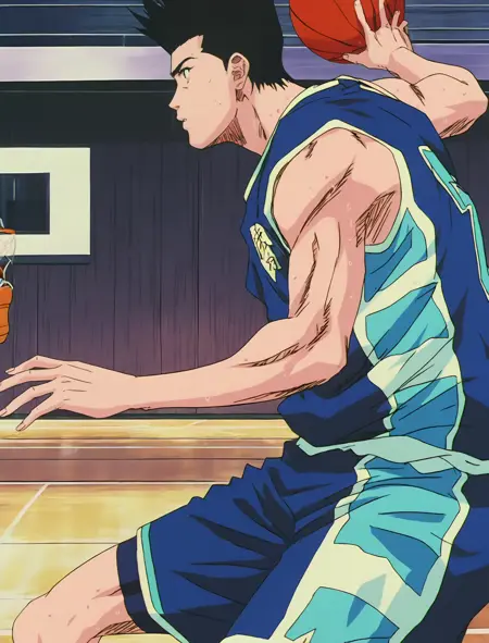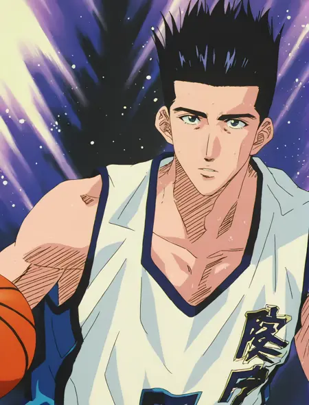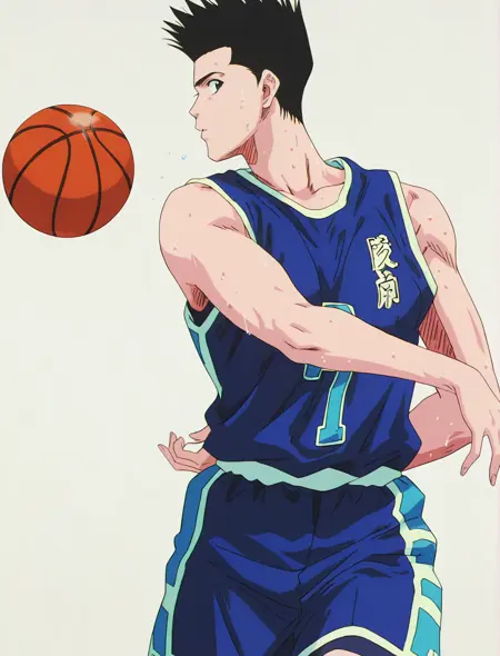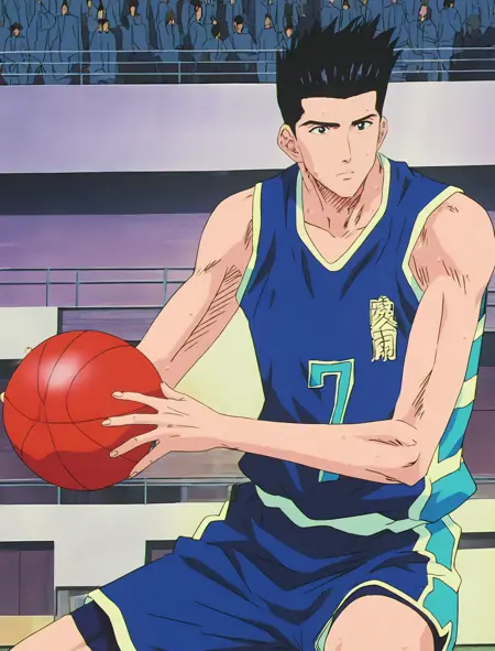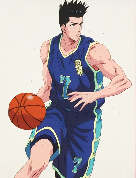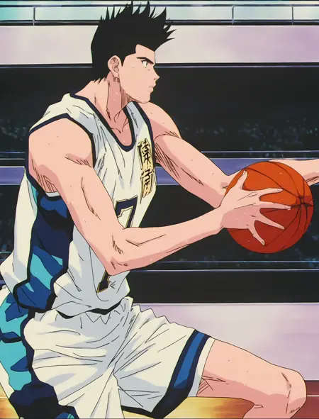 "动漫截图,动漫源,动漫上色,杰作,最佳画质,高分辨率,4K,8K"。如果希望他穿着白色球衣,请在提示中添加:"Ryonan 白色篮球球衣"。