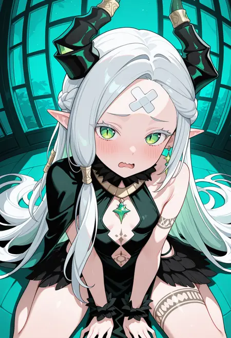 stsraelo, very long hair, white hair, blonde streaks, half updo, braid, single hair tube, green eyes, tsurime, hair between eyes, slit pupils, single earring, colored eyelashes, pointy ears, demon horns, horn ornament,