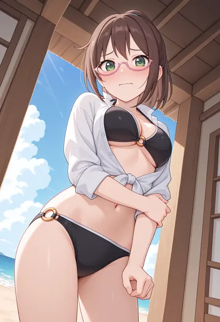 • dress shirt, tied shirt, open shirt, white shirt, black bikini, halterneck, o-ring bikini,