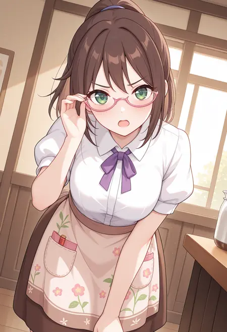 • rlpmifu, brown hair, medium hair, green eyes, ponytail, semi-rimless eyewear, pink-framed eyewear,