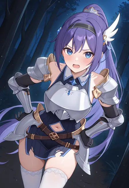 • pmifudef, black hairband, wing hair ornament, collared dress, sleeveless dress, armored dress, pauldrons, breastplate, ribbed dress, short dress, black dress, blue dress, faulds, hip armor, crossed belts, white thighhighs, vambraces, elbow gloves, black gloves,