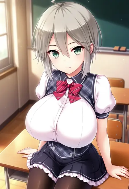 1 학교 유니폼, 빨간 리본 넥타이, 흰색 셔츠, 풍성한 짧은 소매, 조끼, 언더버스트, 체크무늬, 주름치마, 프릴 치마, 검정 치마, 검정 팬티스타킹