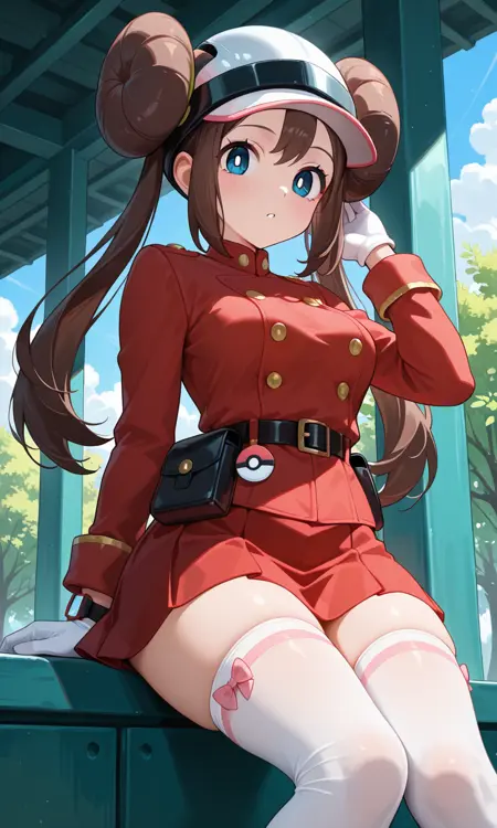Rosa (Pokemon All Series), long hair, brown hair, double bun, doughnut hair bun, twintails, bangs, blue eyes, white pupils, pink bow, wristwatch on one arm, medium breasts, thighs, helmet, red jacket, long sleeves, white gloves, black belt, belt pouch, red skirt, zettai ryouiki, white thighhighs