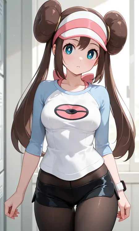 Rose (Pokemon All Series), long hair, brown hair, double bun, doughnut hair bun, twintails, visor cap, blue eyes, white pupils, pink bow, wristwatch on one arm, large breasts, thighs