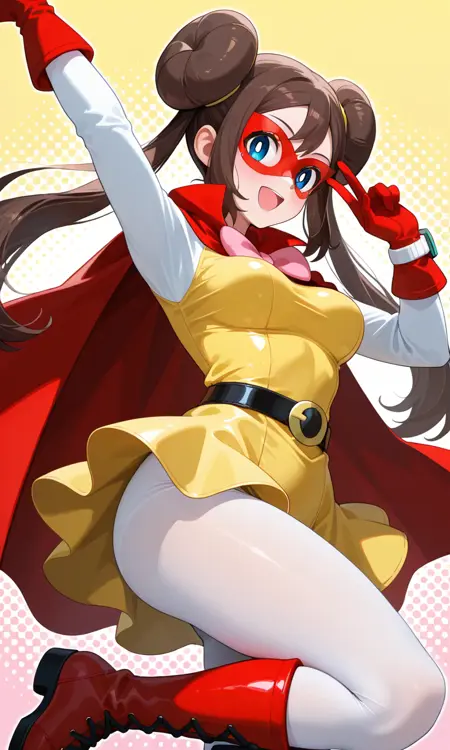 Rosa (Pokemon All Series), long hair, brown hair, double bun, doughnut hair bun, twintails, blue eyes, white pupils, pink bow, wristwatch on one arm, medium breasts, thighs, superhero, yellow dress, red cape, brooch, domino mask, red mask, red gloves, belt, white pantyhose, red footwear, knee boots, cleavage cutout