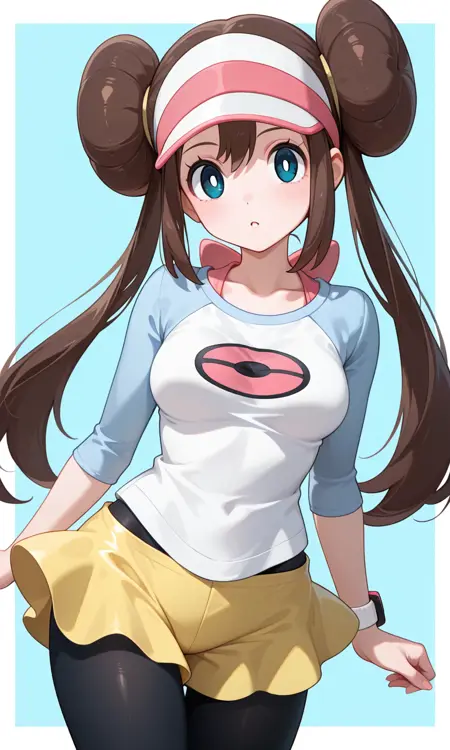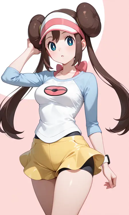 Rosa (Pokemon All Series), long hair, brown hair, double bun, doughnut hair bun, twintails, visor cap, blue eyes, white pupils, pink bow, wristwatch on one arm, medium breasts, thighs, collarbone, shirt, printed shirt, raglan sleeves, wristwatch, short shorts, yellow shorts, pantyhose under shorts, black pantyhose, frilly flared shorts, mustard yellow shorts, wristwatch on one arm