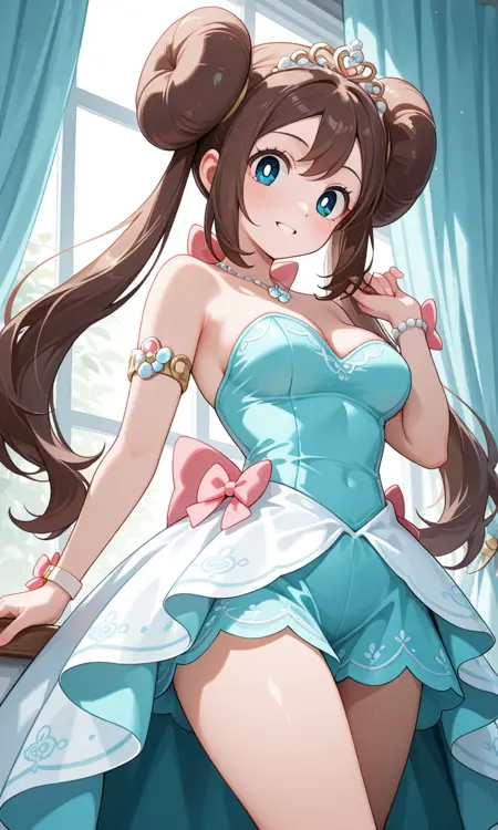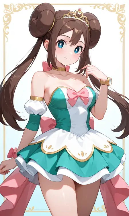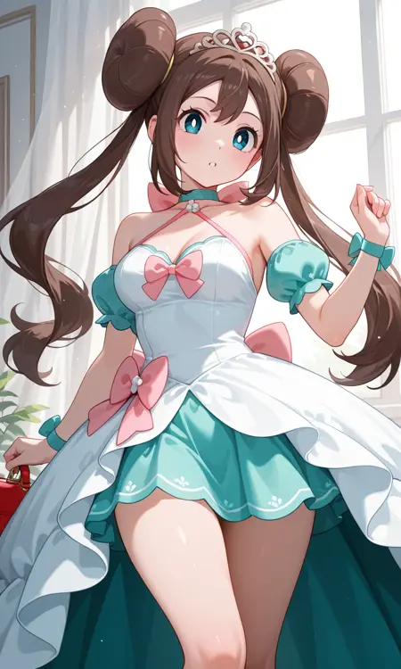 Rosa (Pokemon All Series), long hair, brown hair, double bun, doughnut hair bun, twintails, tiara, wavy hair, blue eyes, white pupils, pink bow, wristwatch on one arm, medium breasts, thighs, aqua dress, white dress, strapless, armlet