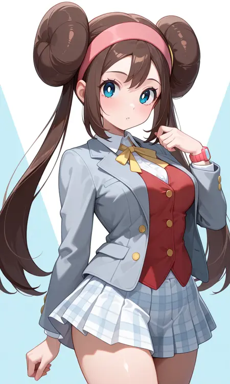 Rosa (Pokemon All Series), long hair, brown hair, double bun, doughnut hair bun, twintails, pink hairband, blue eyes, white pupils, pink bow, wristwatch on one arm, medium breasts, thighs, grey jacket, blazer, buttons, open jacket, long sleeves, red vest, white shirt, collared shirt, neck ribbon, yellow ribbon, white skirt, pleated skirt, checkered skirt