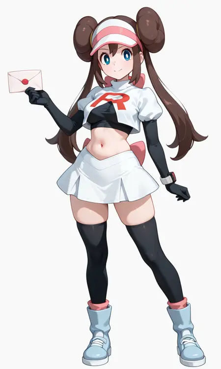 Rosa (Pokemon All Series), long hair, brown hair, double bun, doughnut hair bun, twintails, visor cap, blue eyes, white pupils, pink bow, wristwatch on one arm, medium breasts, thighs, Cosplay_TeamRocket, team rocket, team rocket (cosplay), white jacket, white skirt, thighhigh boots, midriff, (clothes writing), (red letter "R"), cropped jacket, elbow gloves, black elbow gloves, black thighhighs, zettai ryouiki, shirt has a red "R" letter on