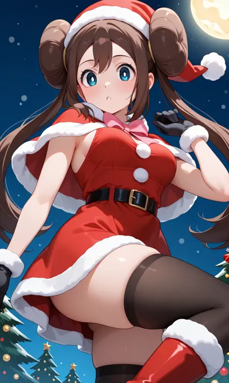 Rosa (Pokemon All Series), long hair, brown hair, double bun, doughnut hair bun, twintails, red headwear, santa hat, blue eyes, white pupils, pink bow, wristwatch on one arm, medium breasts, thighs, santa costume, red capelet, red dress, santa dress, sleeveless dress, black gloves, fur-trimmed gloves, belt buckle, black thighhighs, red footwear, boots