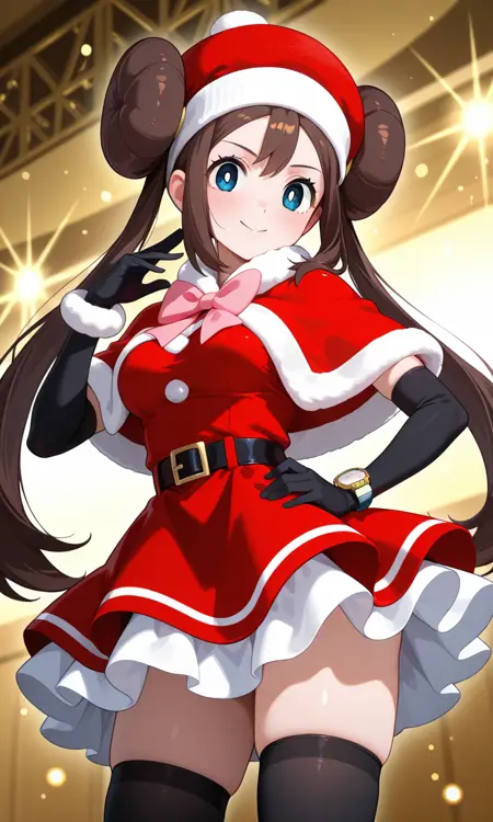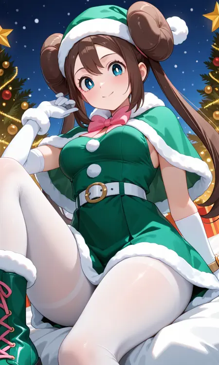 Rosa (Pokemon All Series), long hair, brown hair, double bun, doughnut hair bun, twintails, sleeveless, blue eyes, white pupils, pink bow, wristwatch on one arm, medium breasts, thighs, green santa costume, green santa hat, fur-trimmed capelet, green capelet, white belt, white gloves, white elbow gloves, white pantyhose, knee boots, green footwear, red footwear