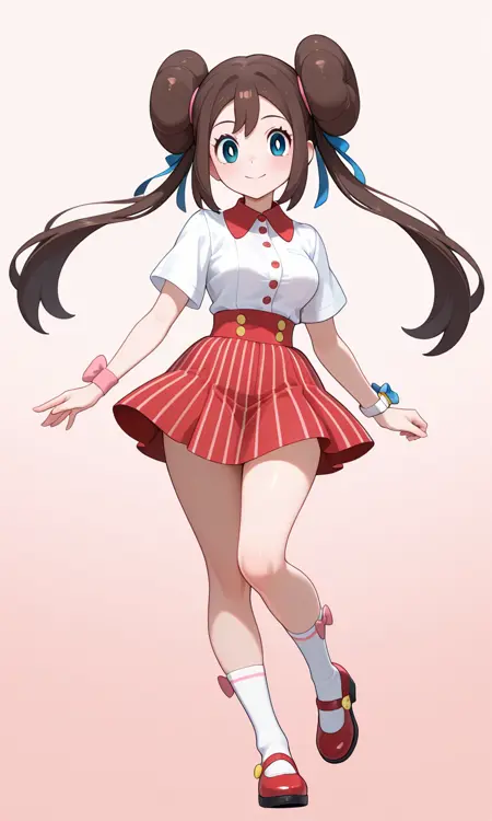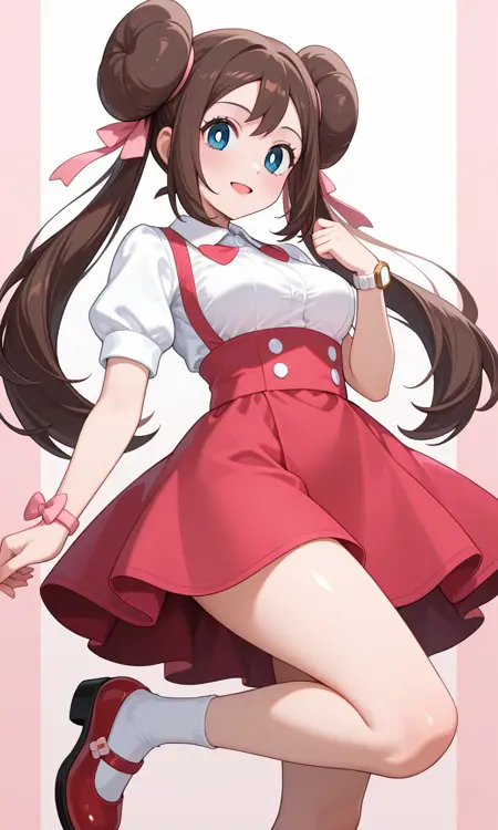 Rosa (Pokemon All Series), long hair, brown hair, double bun, doughnut hair bun, twintails, blue eyes, white pupils, pink bow, wristwatch on one arm, medium breasts, thighs, hair ribbon, blue ribbon. dress, collared shirt, white shirt, short sleeves, red buttons, red skirt, medium skirt, striped skirt, blue stripes, multicolored clothess, white pockets, wrist bow, pink bow, single bracelet, white socks, red footwear, mary janes