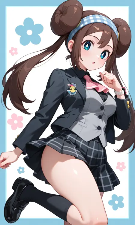 Rosa (Pokemon All Series), long hair, brown hair, double bun, doughnut hair bun, twintails, blue hairband, gingham hairband, blue eyes, white pupils, pink bow, wristwatch on one arm, medium breasts, thighs, black jacket, open jacket, black shirt, collared shirt, long sleeves, light grey vest, buttons, red ascot, black skirt, pleated skirt, checkered skirt, emblem, black socks, kneehighs, loafers, black footwear