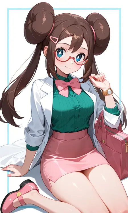 Rosa (Pokemon All Series), long hair, brown hair, double bun, doughnut hair bun, twintails, hair clip, blue eyes, white pupils, pink bow, wristwatch on one arm, medium breasts, thighs, semi-rimless eyewear, red-framed eyewear, labcoat, long sleeves, green shirt , pink skirt, pencil skirt, bare legs, shoes, pink footwear