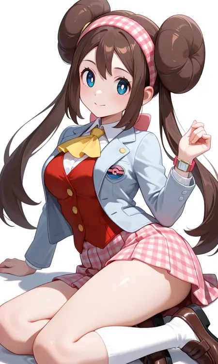 Rosa (Pokemon All Series), long hair, brown hair, double bun, doughnut hair bun, twintails, red hairband, gingham hairband, blue eyes, white pupils, pink bow, wristwatch on one arm, medium breasts, thighs, light grey jacket, open jacket, white shirt, collared shirt, long sleeves, red vest, buttons, yellow ascot, white skirt, pleated skirt, checkered skirt, emblem, white socks, thighhigs, loafers, brown footwear