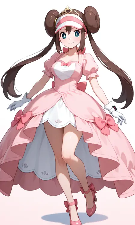 Rosa (Pokemon All Series), long hair, brown hair, double bun, doughnut hair bun, twin drills, visor cap, blue eyes, white pupils, pink bow, wristwatch on one arm, medium breasts, thighs, collarbone, pink dress, very long dress, short sleeves, white gloves, tiara, pink footwear, high heels