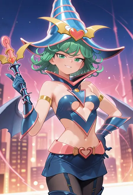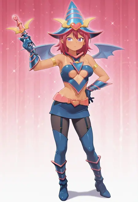 BREAK <lora:cm-girl -V1>,chocolate_magician_girl \(cosplay\), holding wand,wand,blue wizard hat,gold armlet,blue demon wings,black pantyhose, blue garter straps,blue thigh boots,