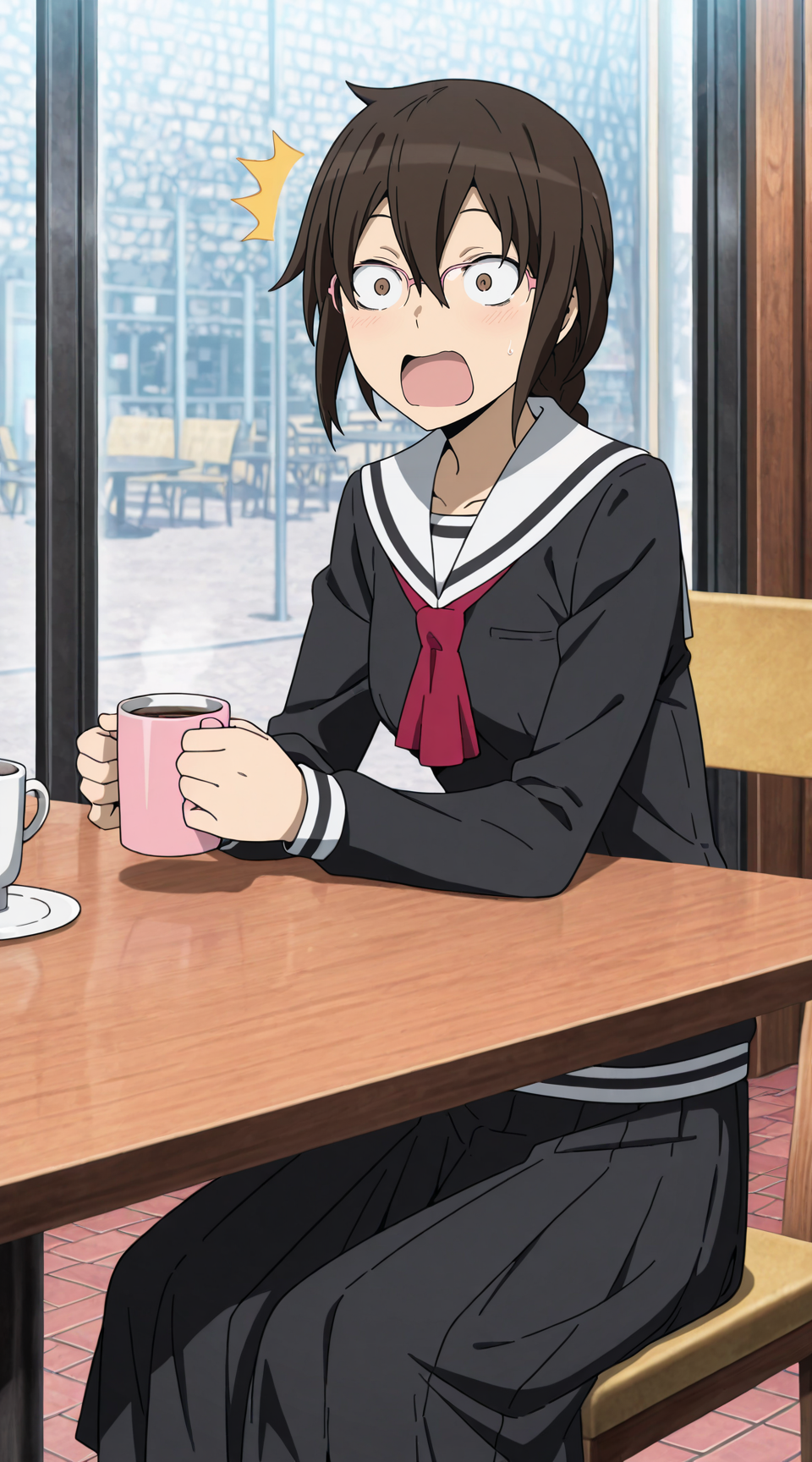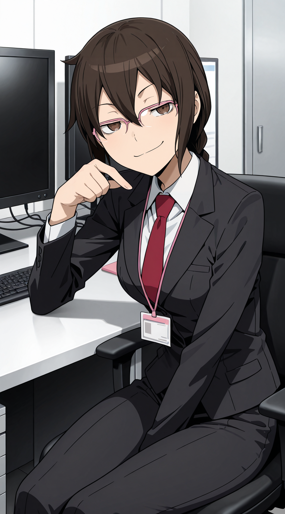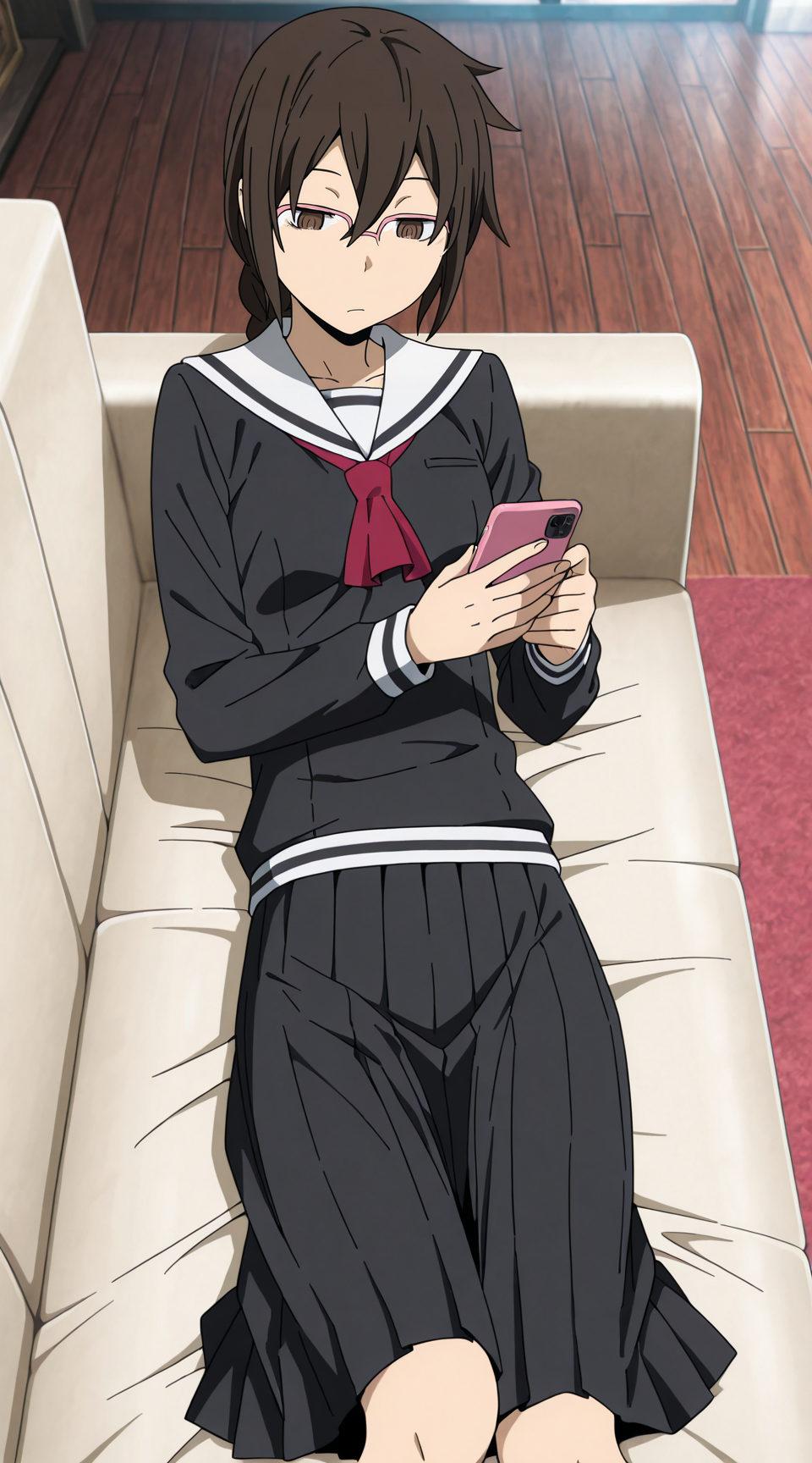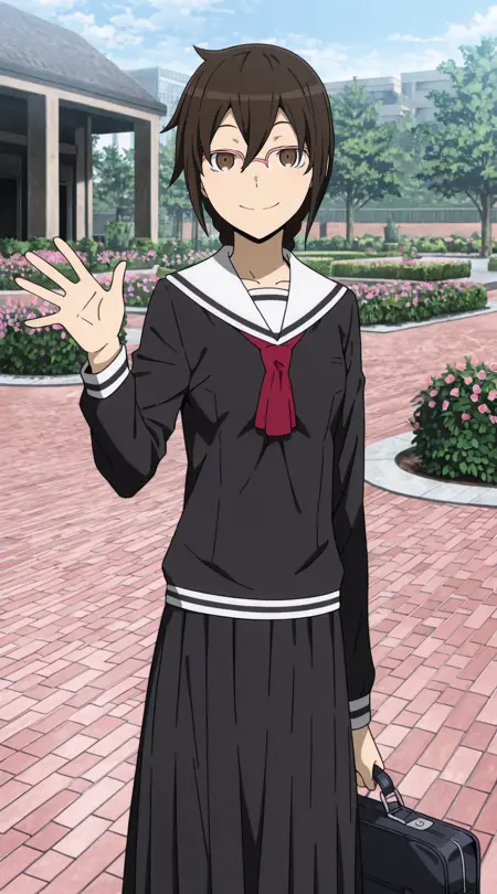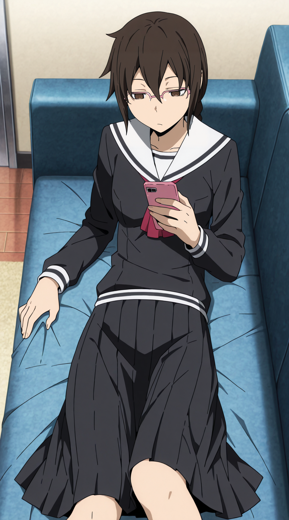 制服用プロンプト:orihara_mairu, pink_glasses, black_serafuku, red_neckerchief, black_pleated_skirt solo, anime_screenshot, long_skirt