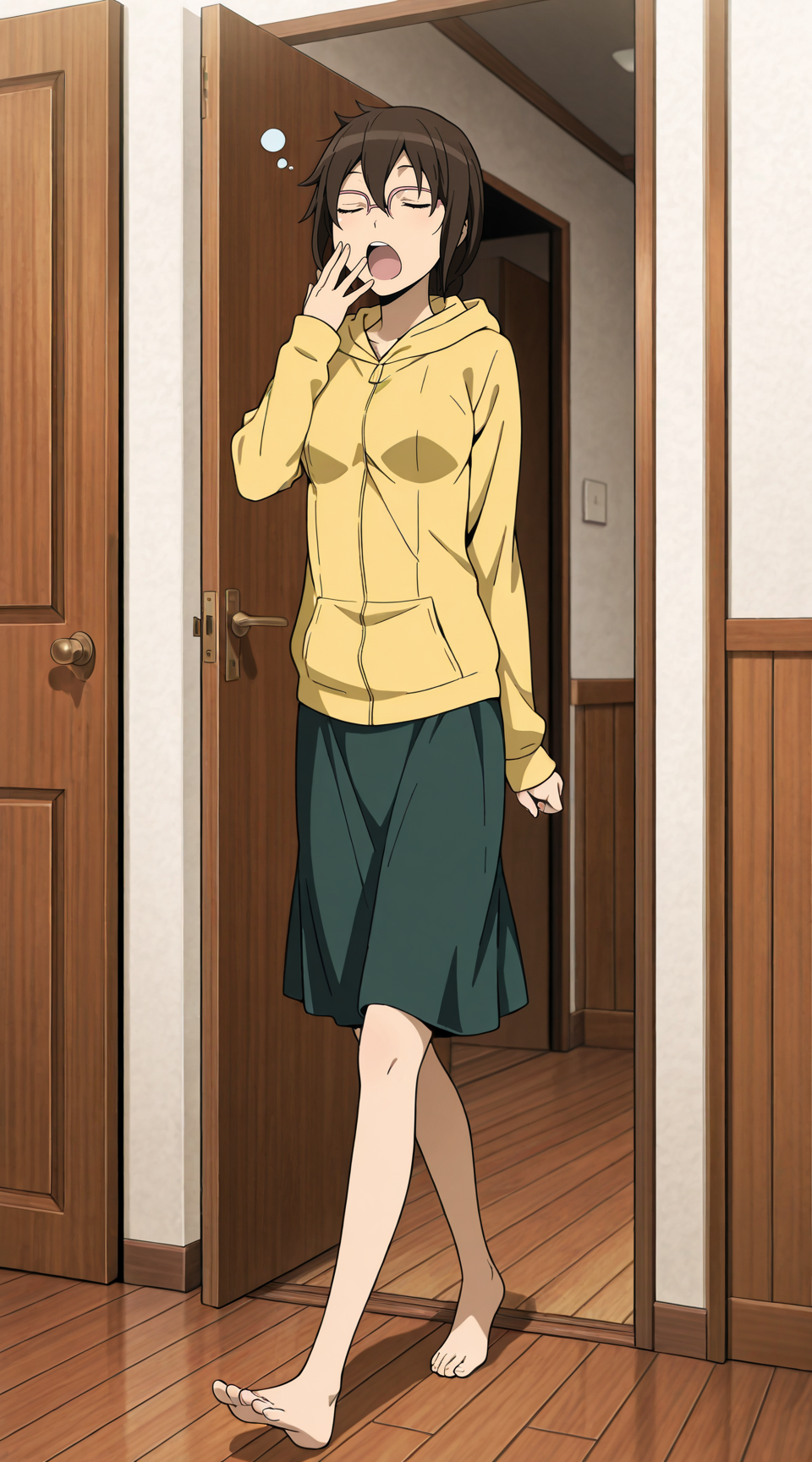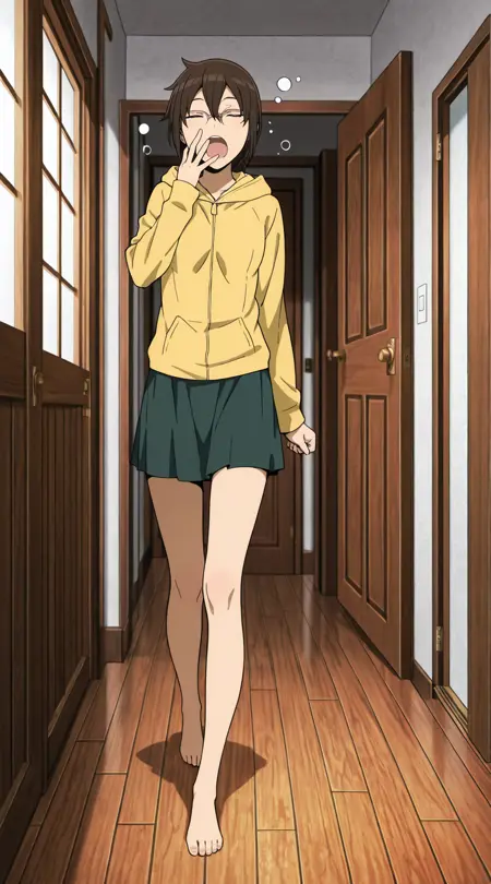 カジュアルなフーディー衣装用プロンプト(フードを上げた状態と下ろした状態をサポート):orihara_mairu, pink_glasses, yellow_hoodie, green_skirt, anime_screenshot