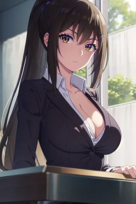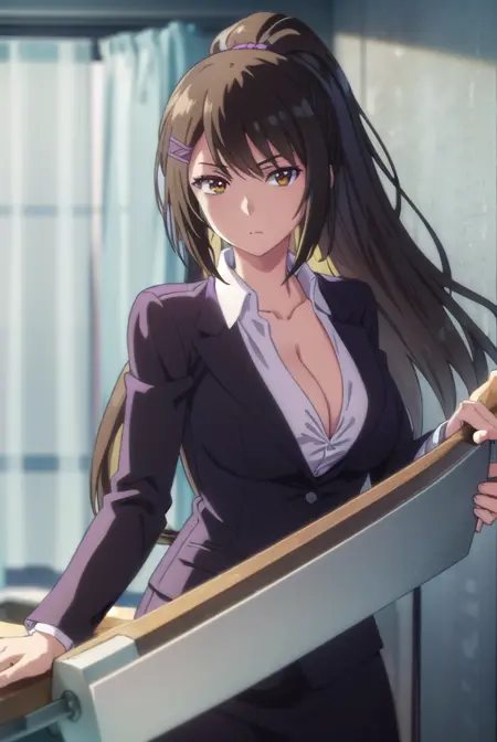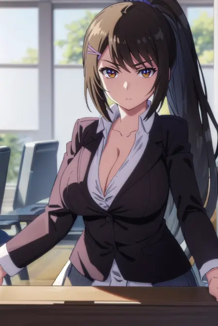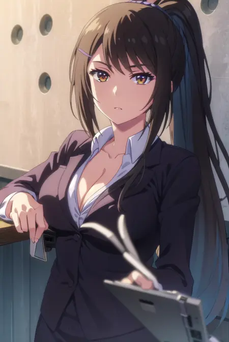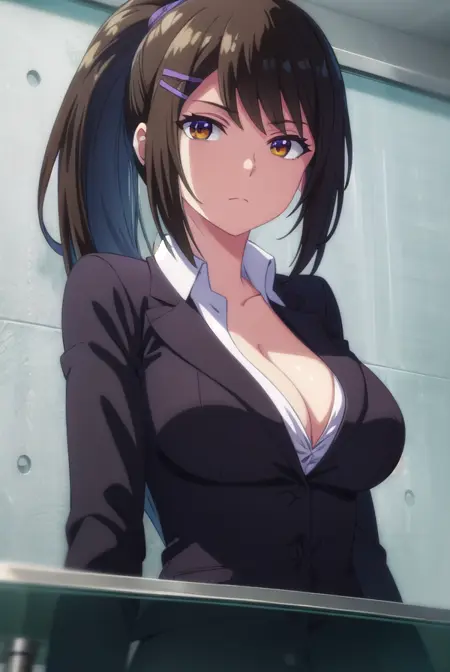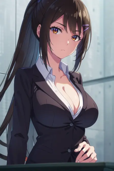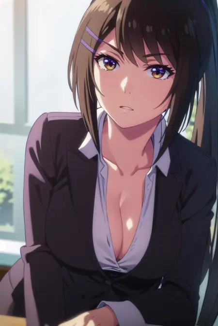 sae chabashira,长发,(黑发:1.5),发饰,(棕眼:1.3),马尾,发夹,
